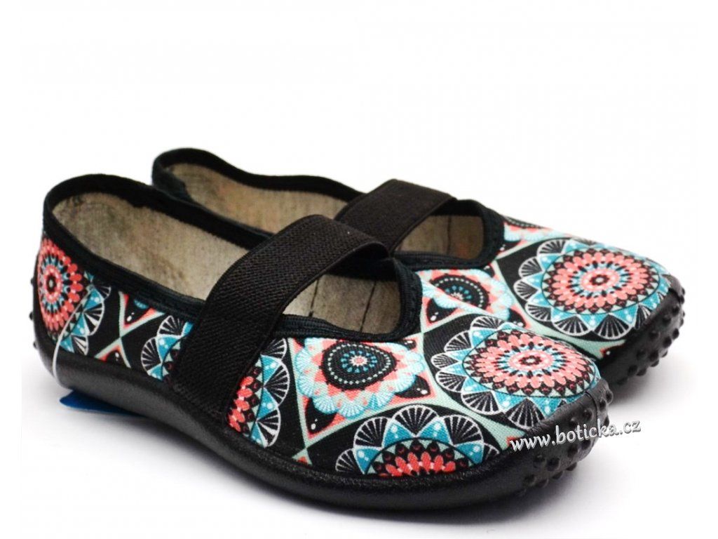 Textilní bačkůrky nazouvací. Lehké, ohebné. Bez stélky. Vhodné pro střední nožičky, nevhodné pro dívky s vyšším nártem. Země původu. Polsko