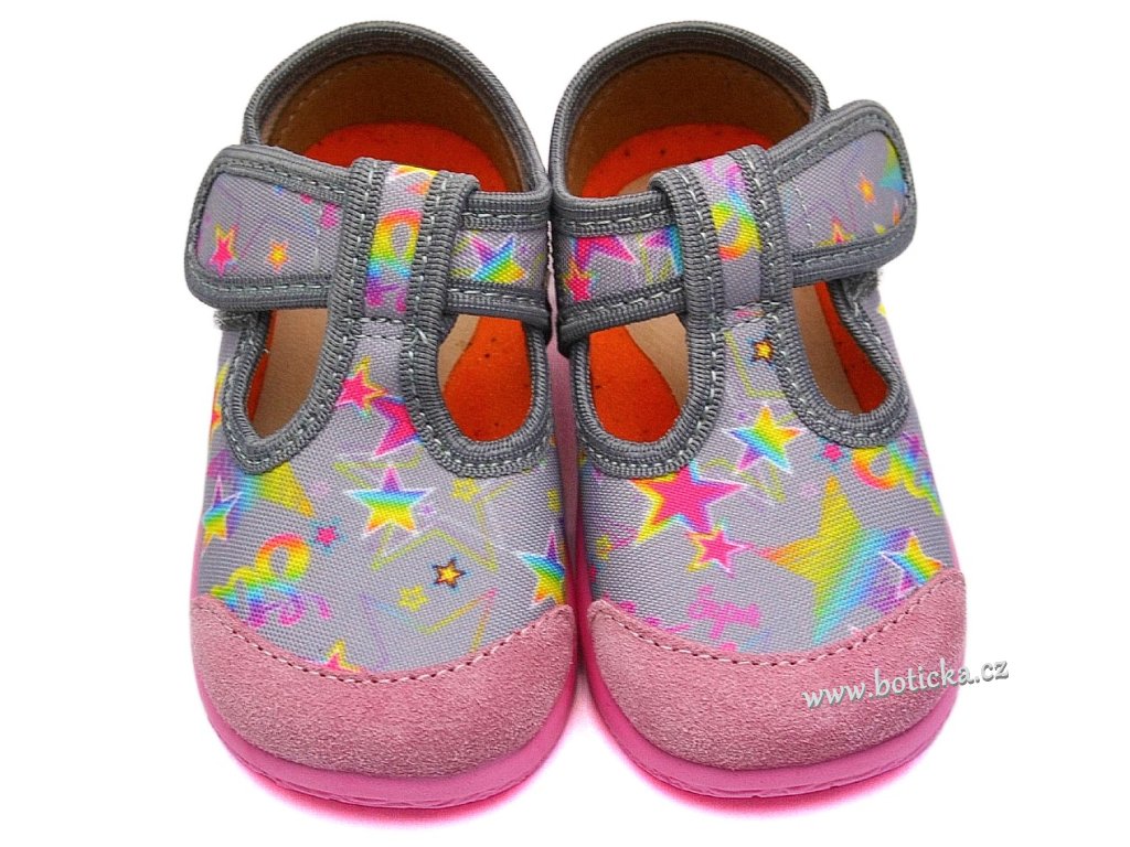 Dívčí bačkory - domácí přezůvky, se zapínáním na suchý zip. Lehké s ohebnou podešví, výhodou je kožená, vyjímatelná, anatomicky tvarovaná stélka a zpevněný opatek. Podešev vhodná i pro pobyt venku. Země původu Srbsko
