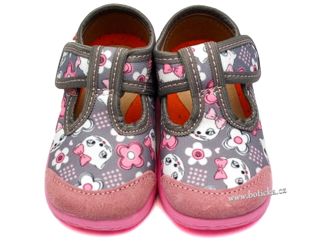 Dívčí bačkory - domácí přezůvky, se zapínáním na suchý zip. Lehké s ohebnou podešví, výhodou je kožená, vyjímatelná, anatomicky tvarovaná stélka a zpevněný opatek. Podešev vhodná i pro pobyt venku. Země původu Srbsko