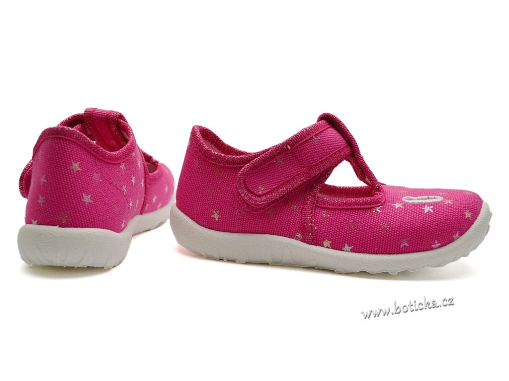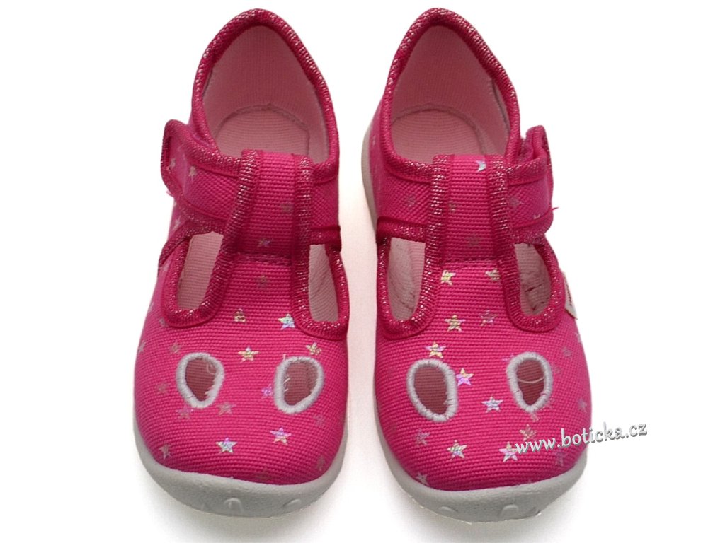 Dívčí bačkůrky / přezůvky se zapínáním na suchý zip. Jsou velmi pohodlné a lehké. Přezůvky jsou provětrávané do podešve, zároveň mají v nártu otvory pro lepší odvod vlhkostí z obuvi ven. Opatek je mírně zpevněný. Podešev je ohebná, ale i odolná, lze je tedy využít i jako sandálky za suchého počasí či na cvičení.