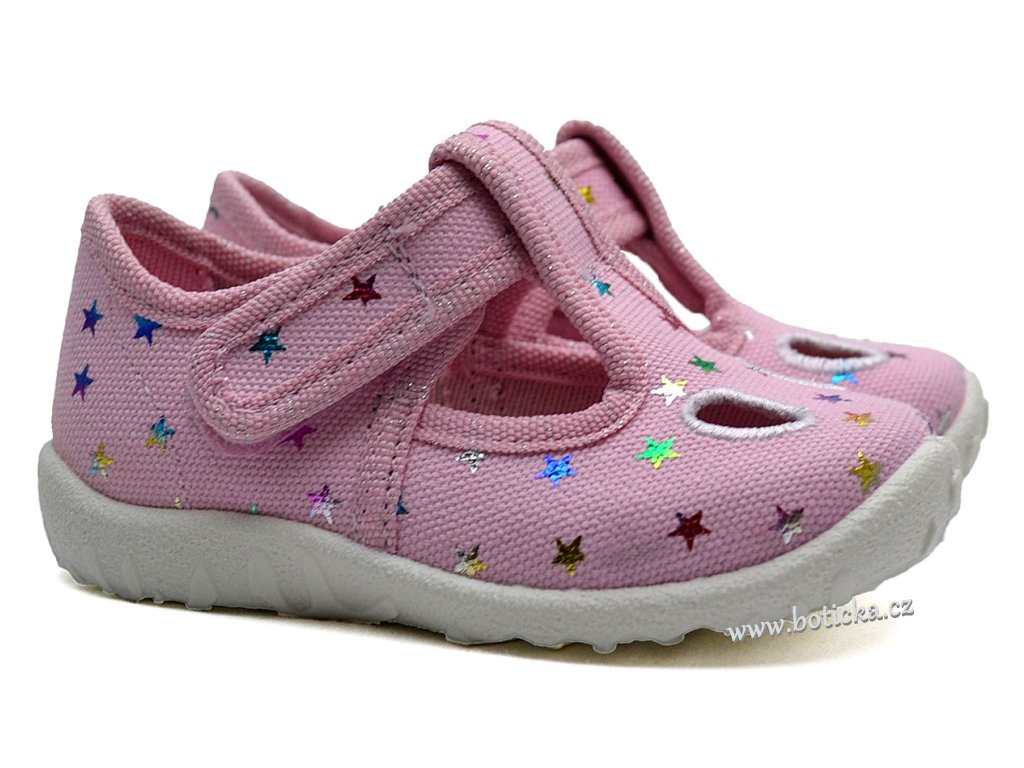 Dívčí bačkůrky / přezůvky se zapínáním na suchý zip. Jsou velmi pohodlné a lehké. Přezůvky jsou provětrávané do podešve, zároveň mají v nártu otvory pro lepší odvod vlhkostí z obuvi ven. Opatek je mírně zpevněný. Podešev je ohebná, ale i odolná, lze je tedy využít i jako sandálky za suchého počasí či na cvičení.