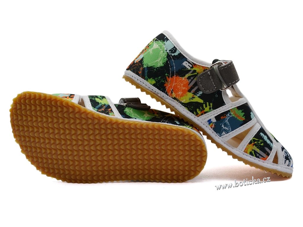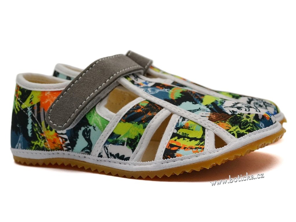 Dětské barefoot přezůvky české, zavedené, firmy JONAP s vylepšeným zapínáním na suchý zip. Bačkory jsou textilní, lehké a ohebné. Díky sandálkovému střihu krásně větrají. Podešev bačkůrek je tenká a flexibilní. Přezůvky mají širší špičku a tak poskytují dostatek prostoru pro dětské prstíky. Bačkůrky mají lehce zpevněný opatek - barefoot kompromis