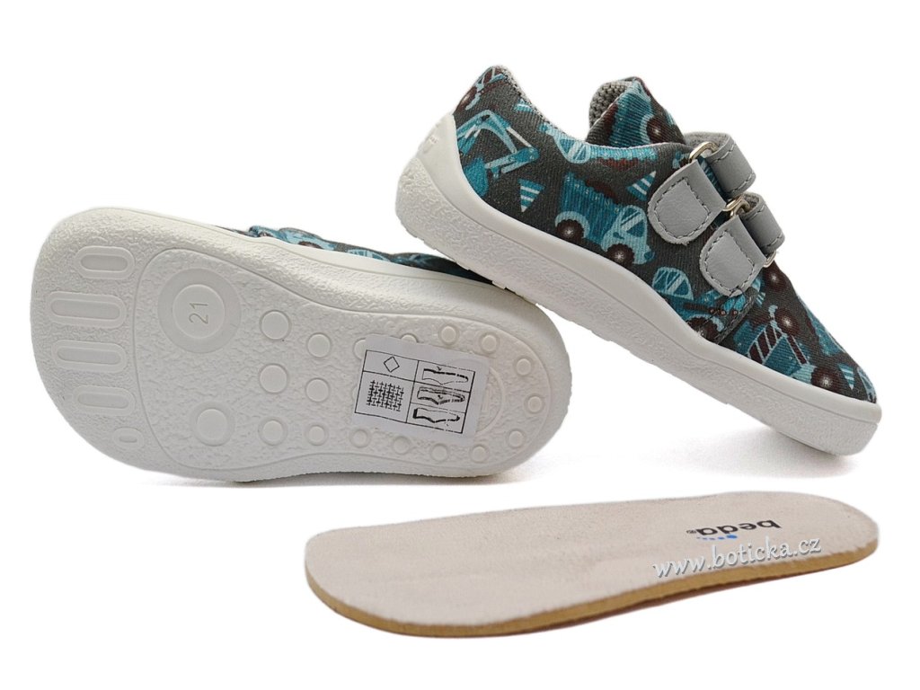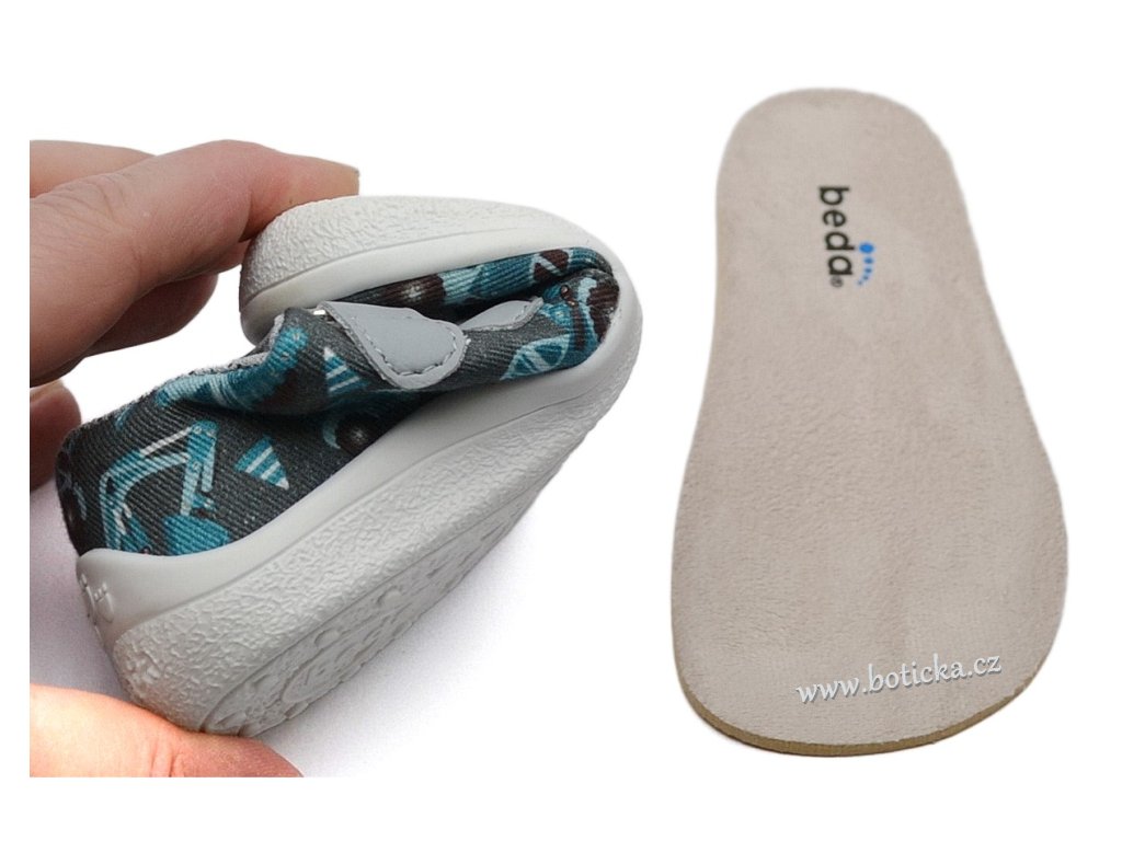 Dětské plátěné barefoot boty české firmy BEDA. Boty jsou lehké, ohebné, s rovnou stélkou bez podpory klenby. Podešev je velmi flexibilní. Špička respektuje anatomický tvar chodidla, jsou tedy vhodné i pro chodidla širší v prstech, užší v oblasti paty. Výhodou je vyjímatelná stélka. Zapínání na suchý zip pro snazší obutí. Boty mají středně zpevněný opatek - barefoot kompromis