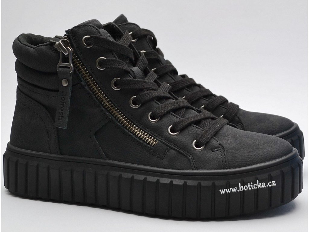 Dámské vyšší, trendy, kotníkové boty značky Refresh. Šněrovací + boční zip. Vnější zip je okrasný, vnitřní se používá pro snadnější prozutí. Zvýšená podrážka s hrubým vzorkem. Střední střih - vhodné pro střední šířku chodidel.