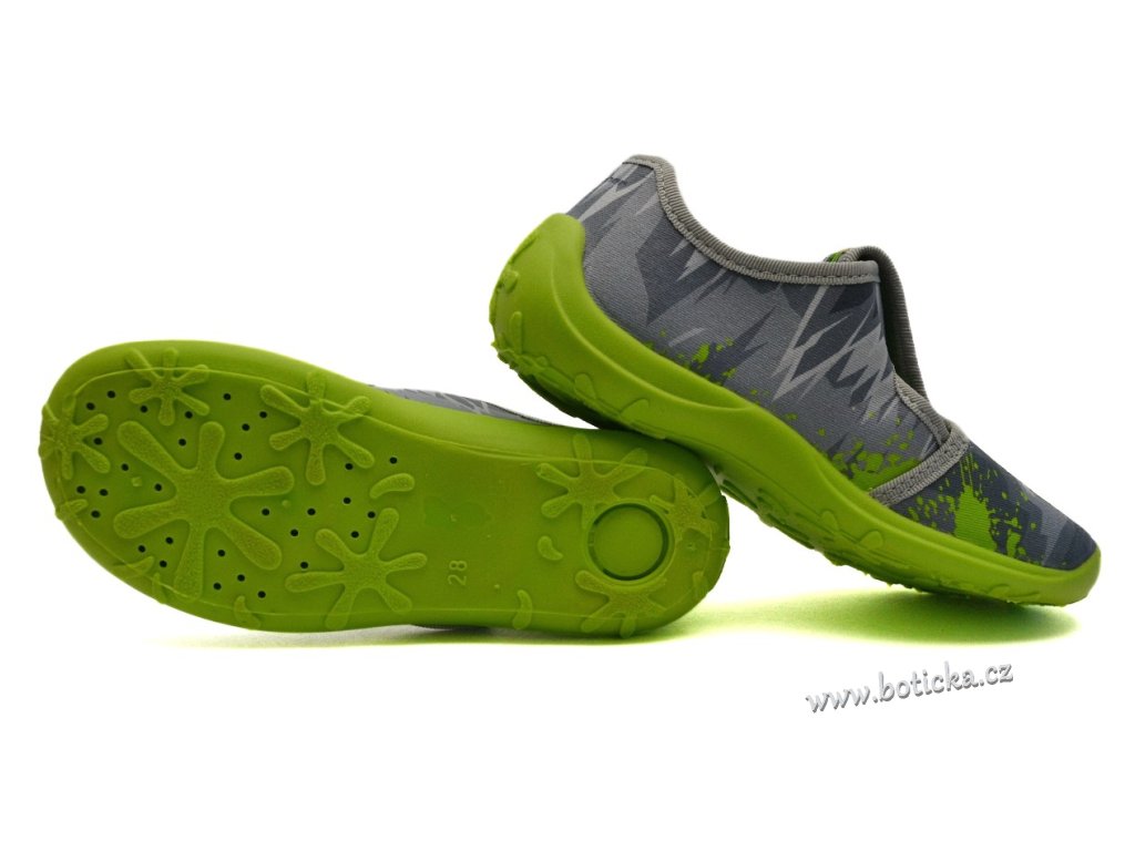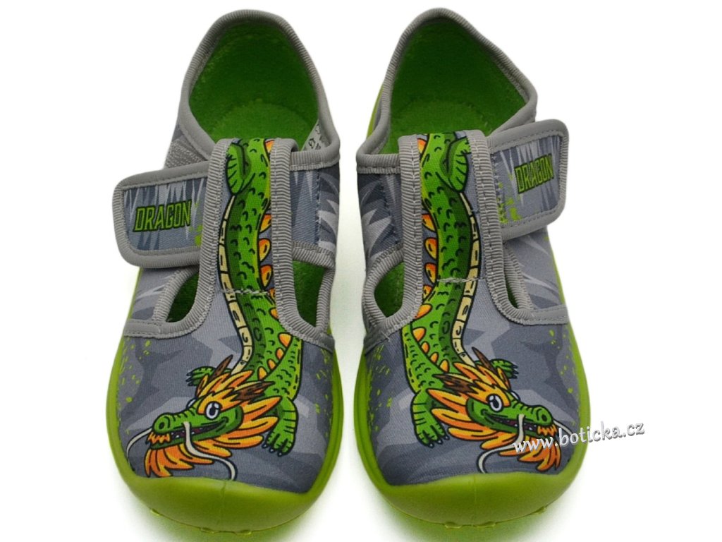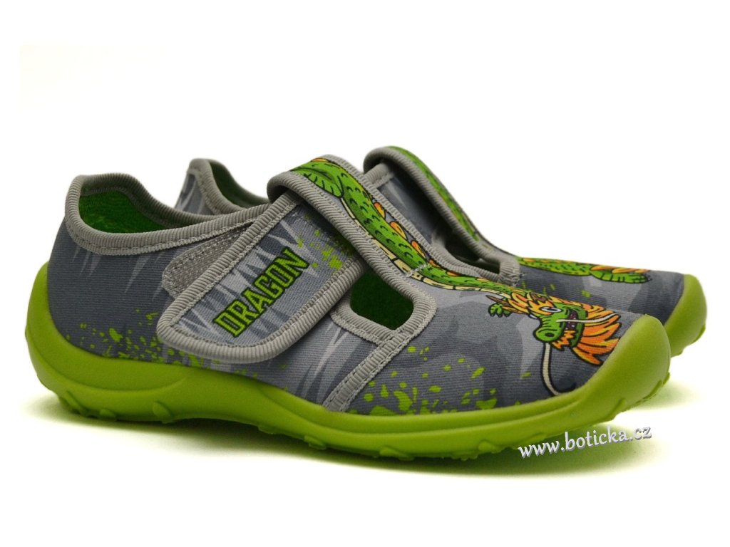 Textilní bačkory se zapínáním na suchý zip. Velmi lehké, ohebné. Provětrávané do podešve. Podšívka jemné froté. Výhodou je mírná okopová špička. Bačkůrky jsou vhodné do interiéru, tedy např. do školky či školy.