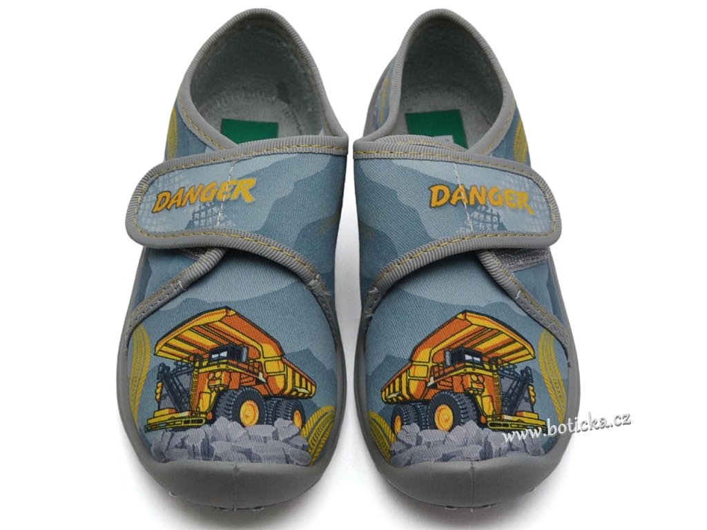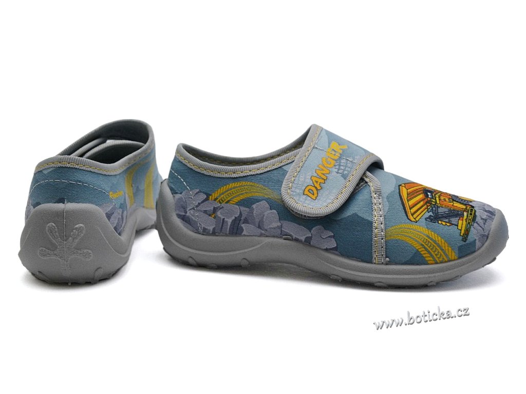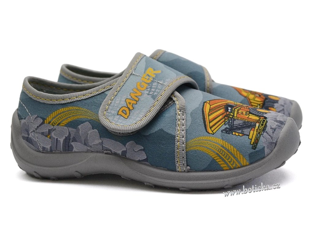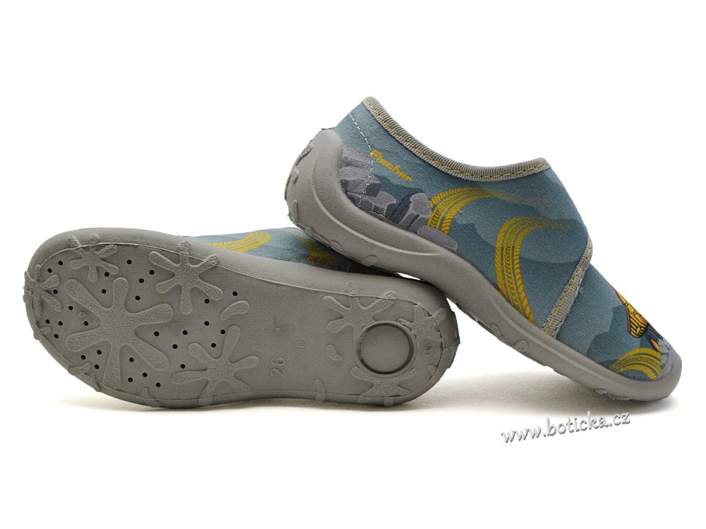 Textilní bačkory se zapínáním na suchý zip. Velmi lehké, ohebné. Provětrávané do podešve. Podšívka jemné froté. Výhodou je mírná okopová špička. Bačkůrky jsou vhodné do interiéru, tedy např. do školky či školy.