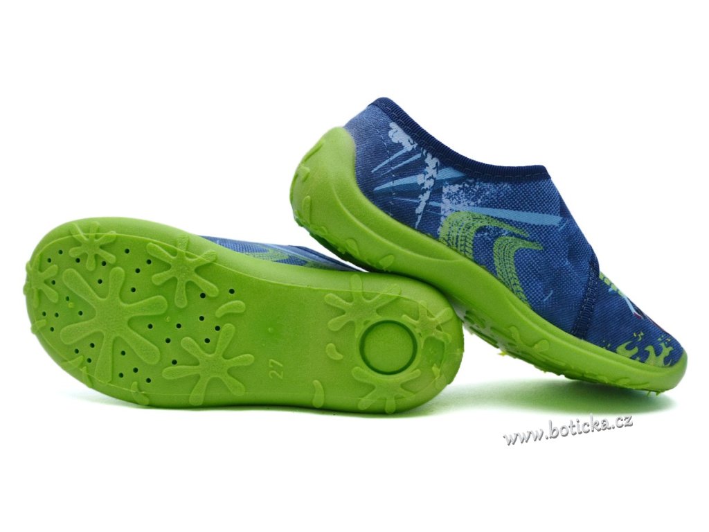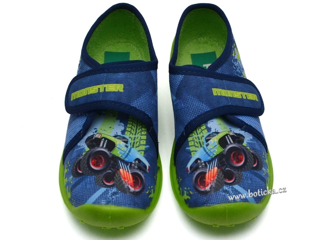 Textilní bačkory se zapínáním na suchý zip. Velmi lehké, ohebné. Provětrávané do podešve. Podšívka jemné froté. Výhodou je mírná okopová špička. Bačkůrky jsou vhodné do interiéru, tedy např. do školky či školy.