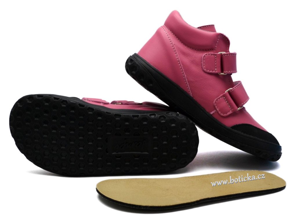 Jde o dětskou, odlehčenou obuv se zapínáním na suchý zip, která simuluje cvičení a proto je vhodná pouze na časově omezenou dobu, nejlépe v nerovném terénu, jako je zahrada, písek, kamínky a podobně. Výhodou je maximálně ohebná podešev, rozšíření v místě prstů, vyjímatelná kožená stélka a mírně zpevněný opatek. Vyrobeno v ČR.