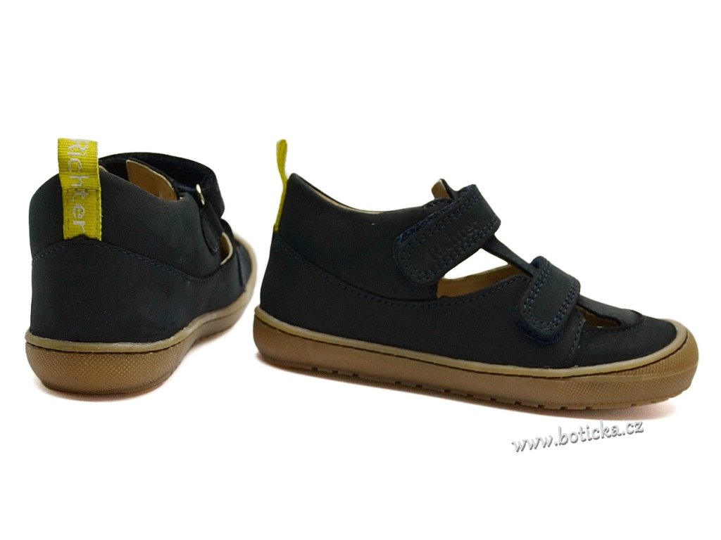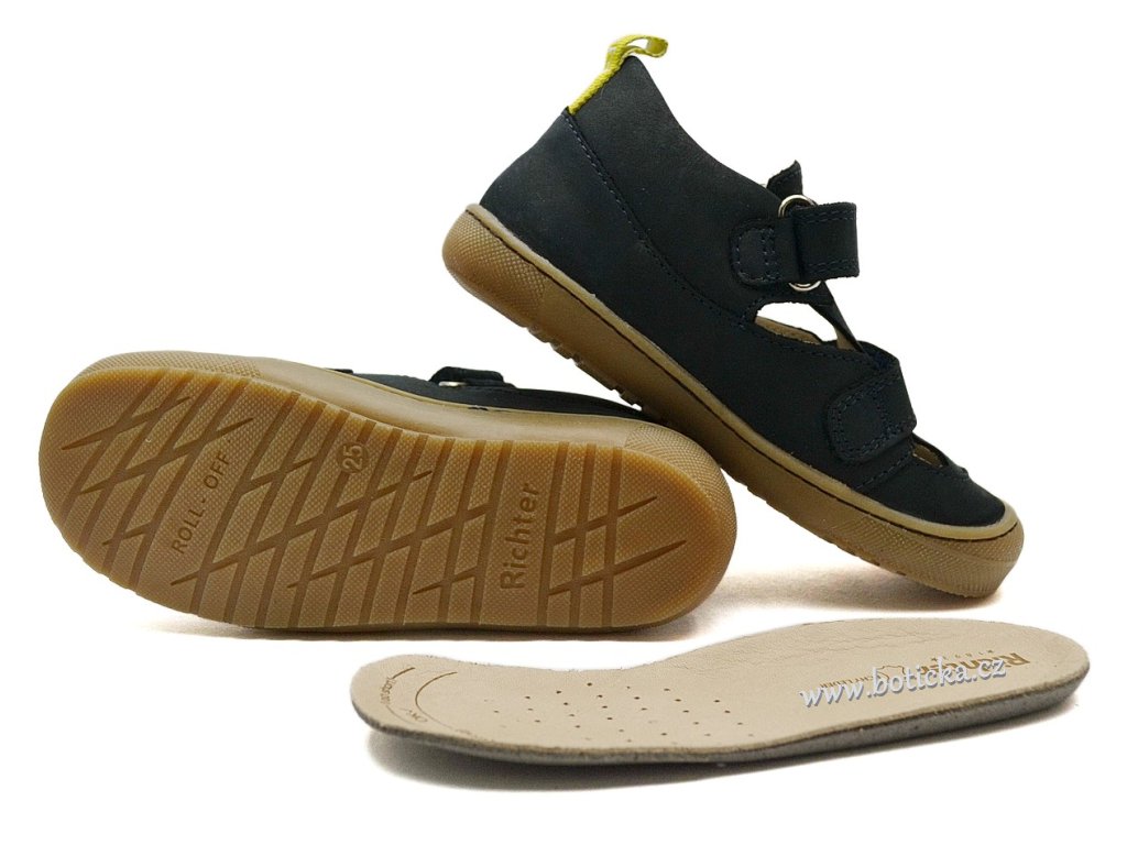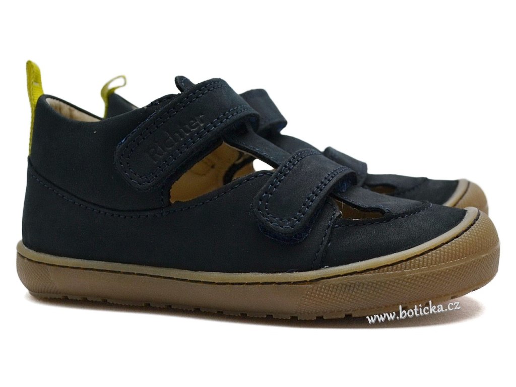 Vycházkové kožené sandále Richter. Jsou extrémně lehké, s maximálně ohebnou podešví, rovnou stélkou a středně zpevněným opatkem. Zapínání na suchý zip. Okopová špička pro lepší ochranu botičky při chůzi. Jsou celoroční, neboť jsou vhodné od cca 20°C a více, v závislosti na individuální tělesné termoregulaci dítěte.