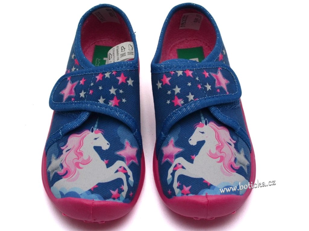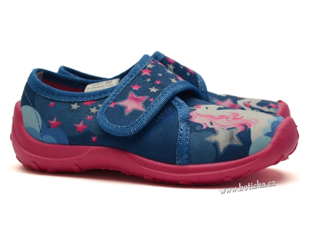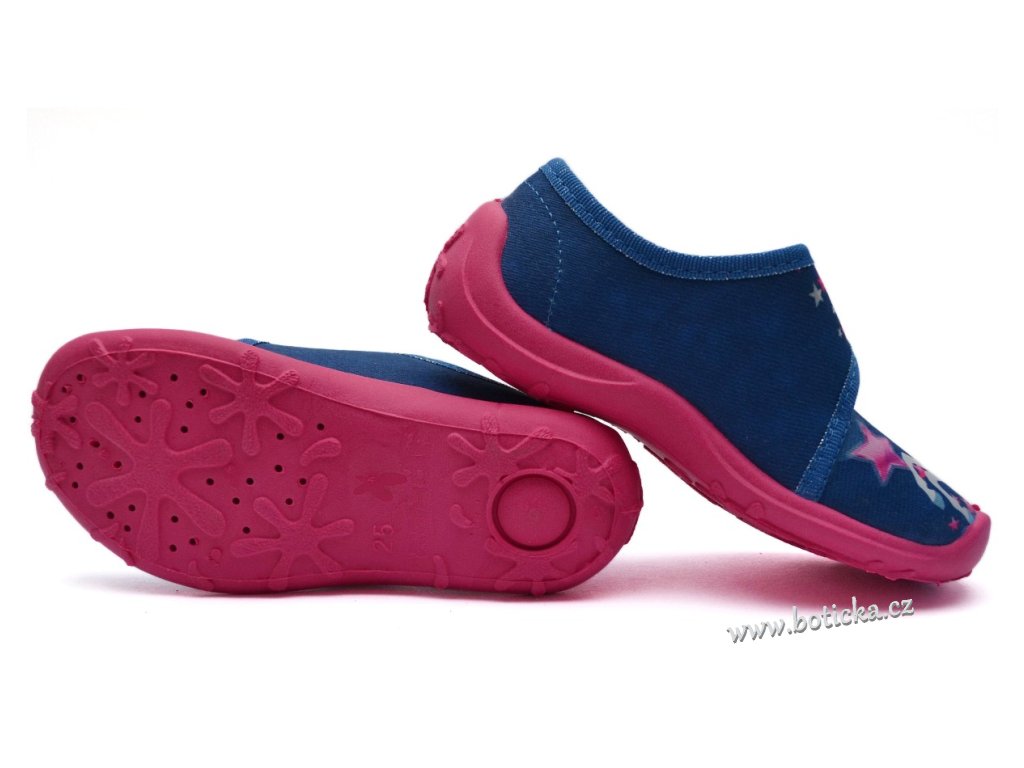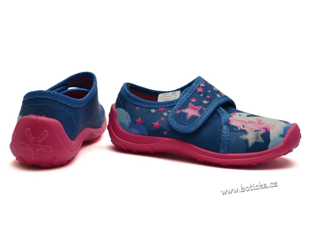 Textilní bačkory se zapínáním na suchý zip. Velmi lehké, ohebné. Provětrávané do podešve. Podšívka jemné froté. Výhodou je mírná okopová špička. Bačkůrky jsou vhodné do interiéru, tedy např. do školky či školy.