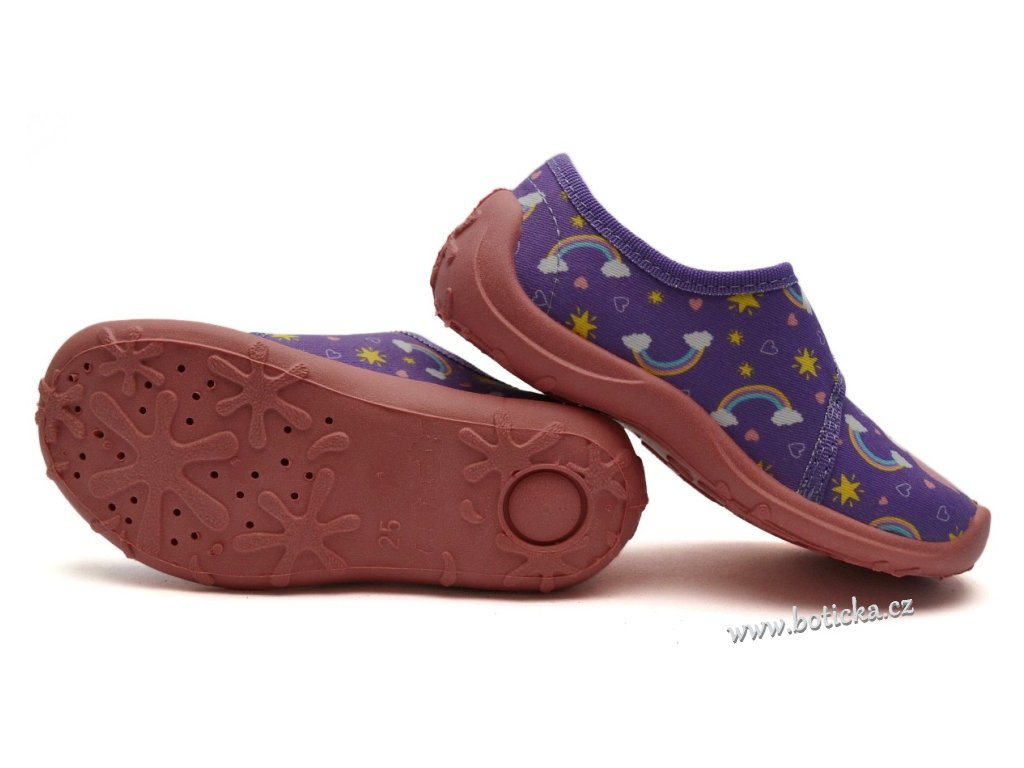 Textilní bačkory se zapínáním na suchý zip. Velmi lehké, ohebné. Provětrávané do podešve. Podšívka jemné froté. Výhodou je mírná okopová špička. Bačkůrky jsou vhodné do interiéru, tedy např. do školky či školy.