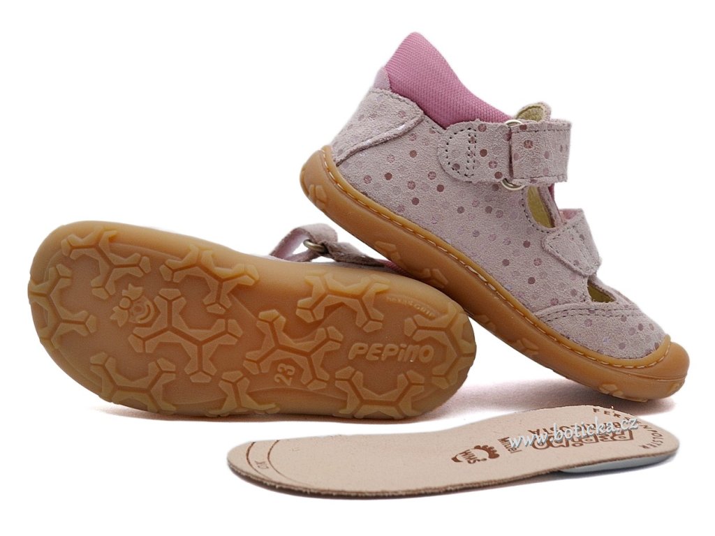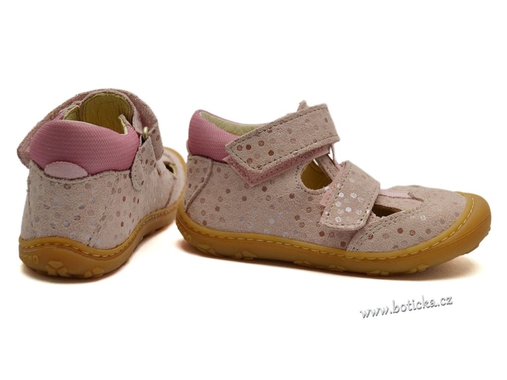Dětské kožené sandále, výhodou je velmi ohebná podešev, vyjímatelná stélka, mírně zpevněný opatek, přední část s ochranou proti okopání, velmi lehké. Oblíbené i pro zastánce barefoot kompromis.