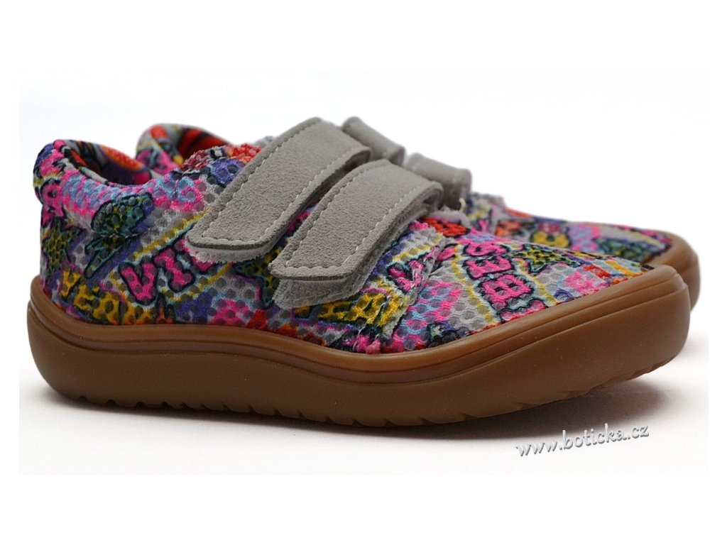 Jde o dětskou, textilní, extrémně odlehčenou obuv se zapínáním na suchý zip, která simuluje cvičení a proto je vhodná nejlépe v nerovném terénu, jako je zahrada, písek, kamínky a podobně. Výhodou je maximálně ohebná podešev, rozšíření v místě prstů, vyjímatelná kožená stélka a mírně zpevněný opatek. Vyrobeno v ČR.