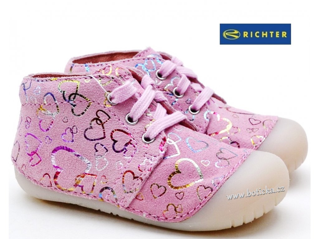 Kožené šněrovací botičky pro děti, které se učí chodit a pro příznivce barefootové obuvi - maximálně ohebná podešev jak podél tak do stran, nulový rozdíl tloušťky podrážky v různých místech boty (tzn. bez podpatku), bez tvarované klenby. Obuv je vhodná na jakýkoliv nerovný terén (tráva, písek, kamínky), který nutí svaly v chodidle pracovat. Střední střih