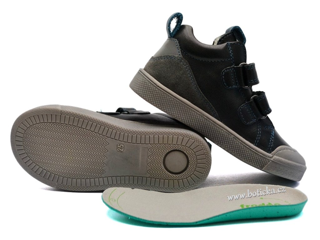 Celoroční kožené vycházkové boty se zapínáním na suchý zip. Anilinová kůže, ze které jsou botky vyrobeny, se vyznačuje příjemným omakem a pružností a patří mezi nejkvalitnější druhy kůže, je vzdušnější oproti jiným typům kůže díky odlišné úpravě. Botky jsou barveny přirozeně za použití transparentních, ve vodě rozpustných barevných látek, které jsou ekologické.