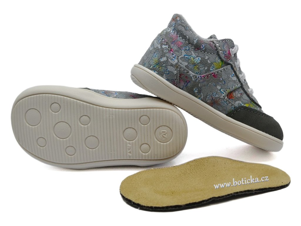 Celoroční vycházkové botičky s krásně ohebnou podešví, šněrovací, vyrobené z broušené kůže s textilní podšívkou, vyvinuty pro maximální flexibilitu a lehkost obuvi, která vyhovuje současným trendům na odlehčenou a flexibilní obuv a vyhovuje zdravotním požadavkům. Výhodou je vyjímatelná textilní stélka a středně zpevněný opatek. Vhodné pro každodenní nošení od jara do pozdního podzimu, v teplotním rozmezí cca 5-18°C v závislosti na vnitřní termoregulaci dítěte. Vyrobeno v ČR.