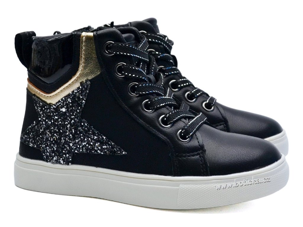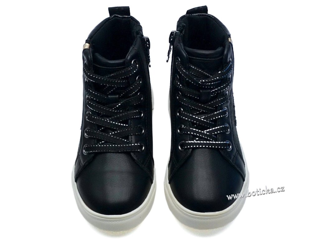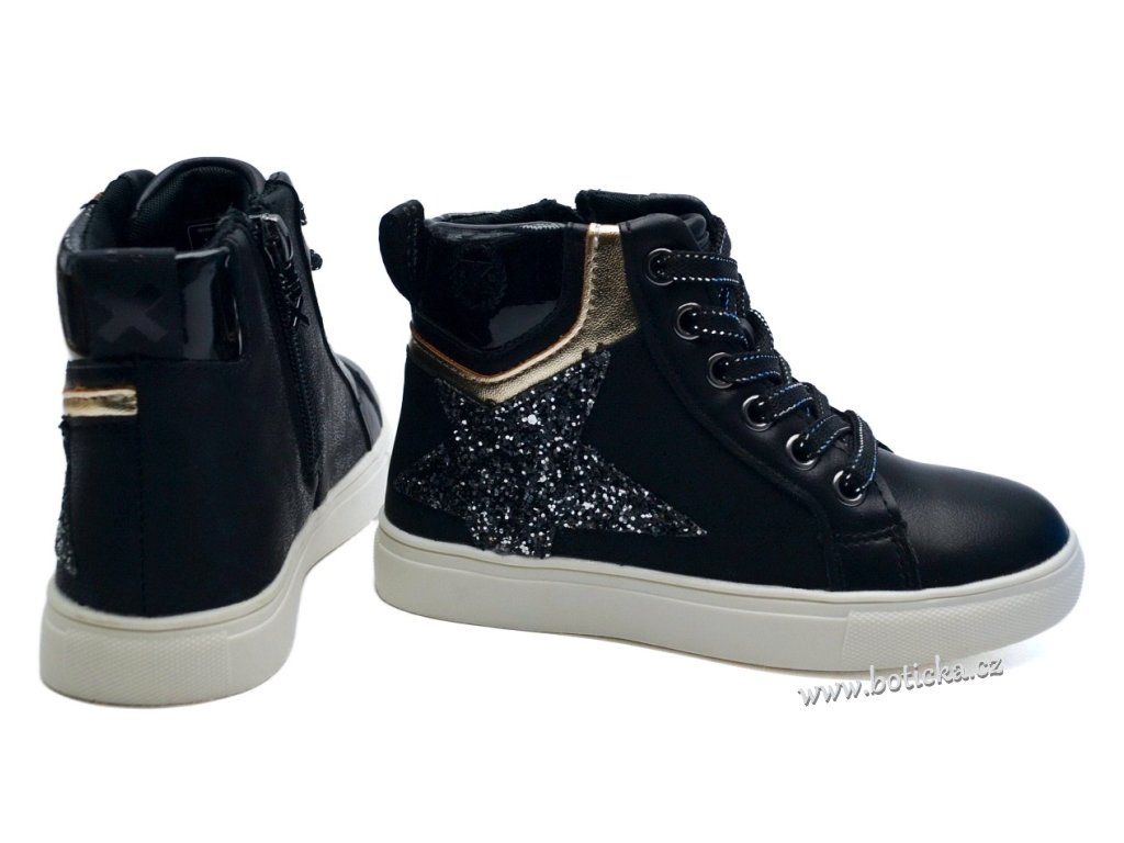 Dívčí kotníčkové vycházkové boty španělské značky XTI Refresh. Botky jsou šněrovací + boční zip pro snazší a rychlejší obouvání. Černé třpytivé. Střední střih - vhodné pro štíhlé a střední nožičky.