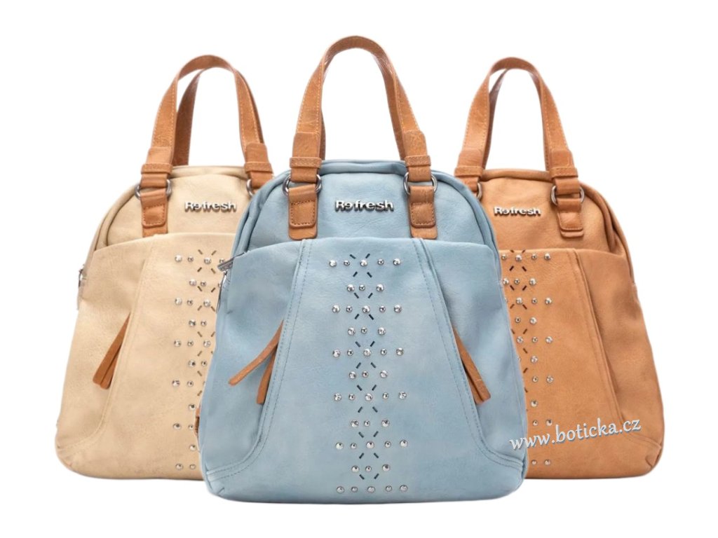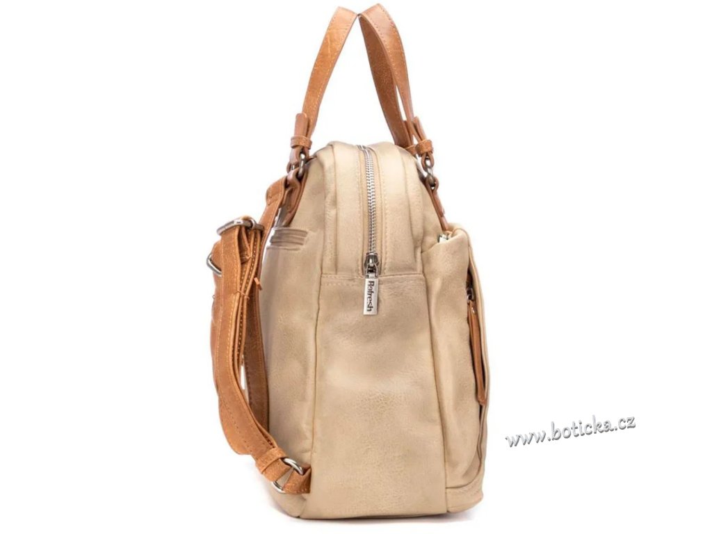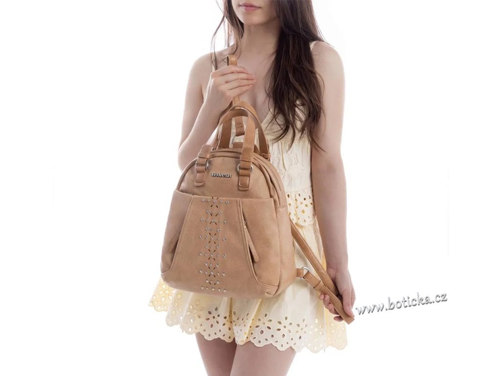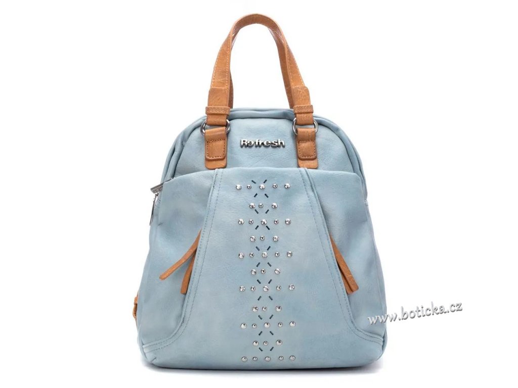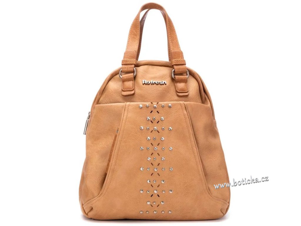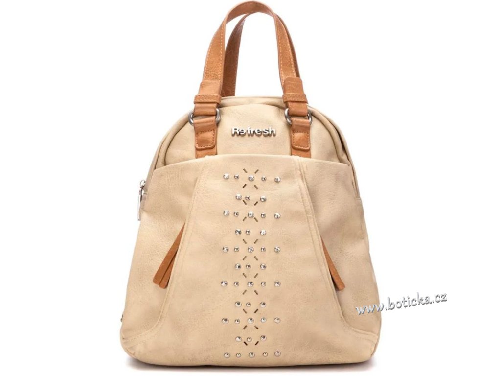 Dámský elegantní batůžek španělské značky Refresh, praktický a pohodlný. Vyroben z materiálu imitujícího kvalitní kůži s nápisem Refresh. Vepředu tři menší kapsičky, vzadu jedna menší na zip. Velká kapsa uprostřed se zapínáním na zip. Zapínání na zip. Ideální doplněk pro váš sportovnější vzhled. S nastavitelnými popruhy pro větší pohodlí.