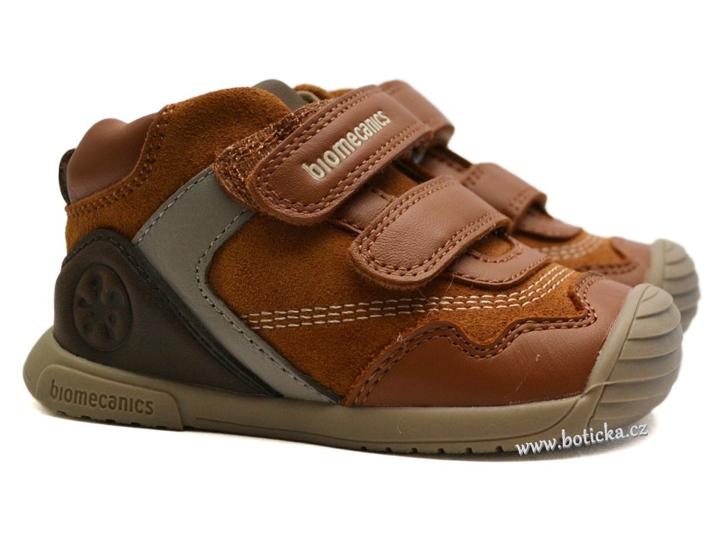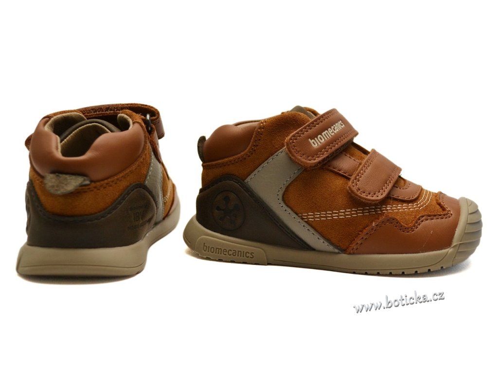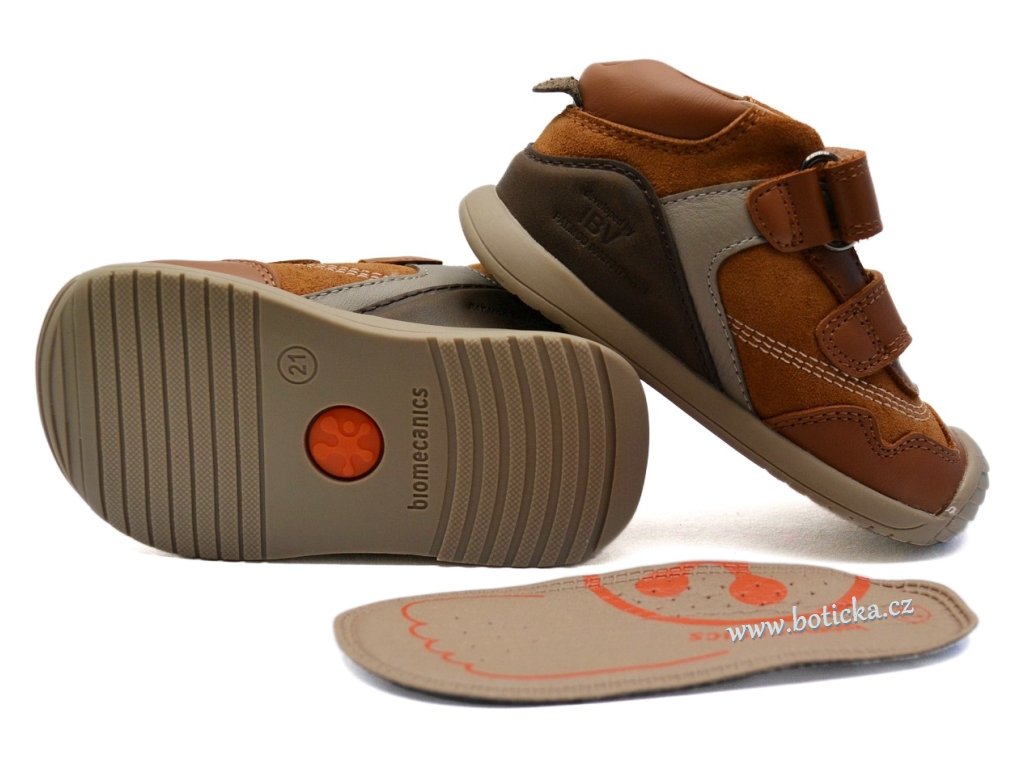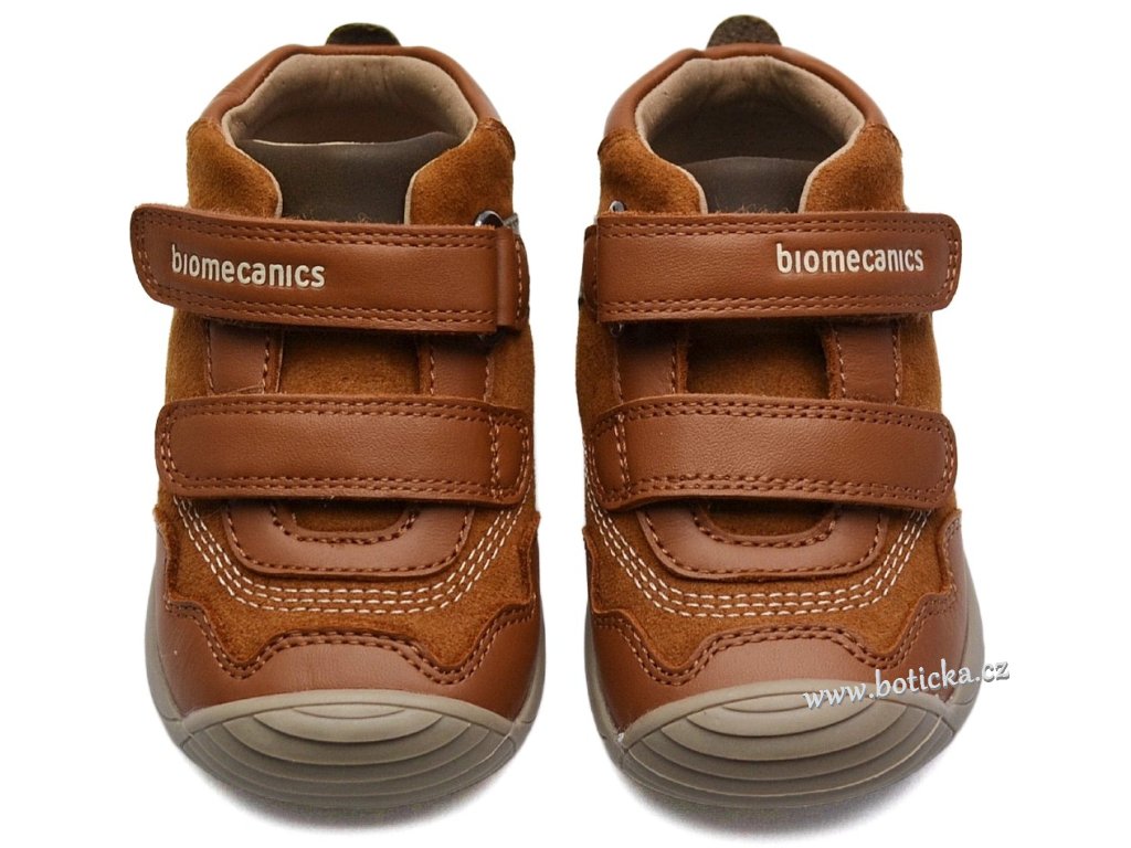 Celoroční kožené botky španělské značky BIOMECANICS. Zapínání na suchý zip. Vyrobeny z přírodních materiálů bez použití chromu či mosazi. Vyjímatelná antibakteriální kožená stélka. Okopová špička chrání botu před rychlým opotřebením. Přední část podešve krásně ohebná. Kotník zůstává pohyblivý díky patě ve tvaru "U", což zabraňuje tlaku na Achillovu patu. Boční stabilizátor, který kontroluje pohyby nohy v bočních směrech. Maximální stabilita díky stélce typu "sloní noha". Navrženo ve spolupráci se španělskou asociací pediatrů.
