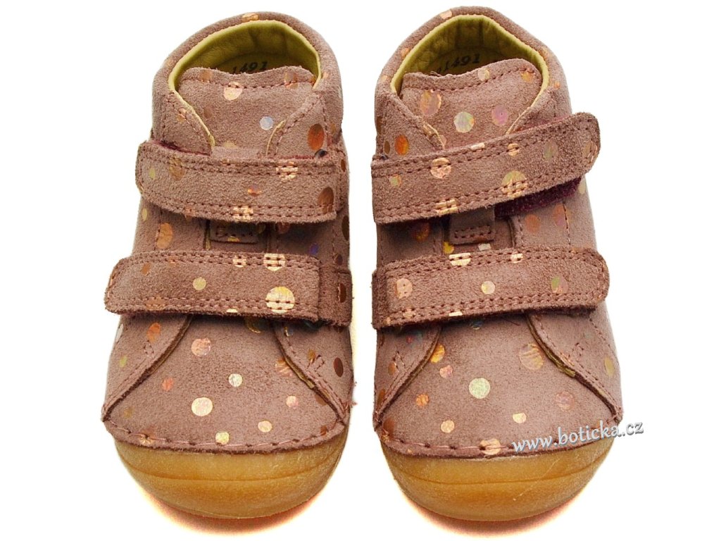 Celoroční kožená vycházková obuv se zapínáním na suchý zip. Anilinová kůže, ze které jsou botky vyrobeny, se vyznačuje příjemným omakem a pružností a patří mezi nejkvalitnější druhy kůže, je vzdušnější oproti jiným typům kůže díky odlišné úpravě. Botky jsou barveny přirozeně za použití transparentních, ve vodě rozpustných barevných látek, které jsou ekologické. Unikátní Flexibilní podešev FLEXIBLE umožňuje maximální ohebnost a poddajnost dětskému chodidlu.