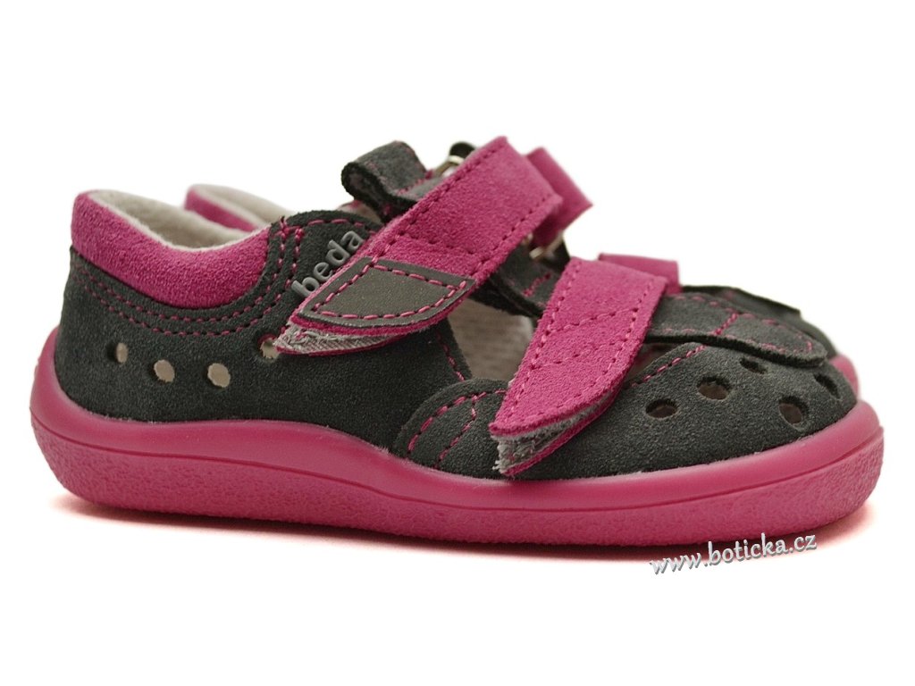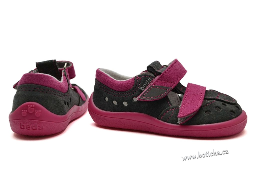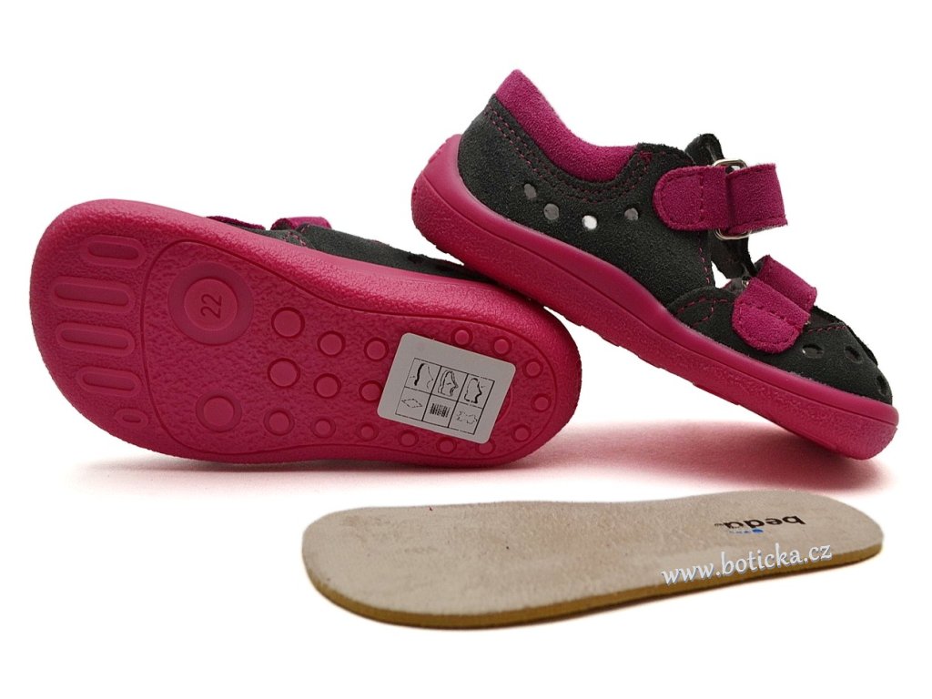 Dětské kožené barefoot sandály české firmy BEDA. Boty jsou lehké, ohebné, s rovnou stélkou bez podpory klenby. Podešev je velmi flexibilní. Špička respektuje anatomický tvar chodidla, jsou tedy vhodné i pro chodidla širší v prstech, užší v oblasti paty. Výhodou je vyjímatelná stélka. Zapínání na suchý zip pro snazší obutí. Boty mají středně zpevněný opatek - barefoot kompromis