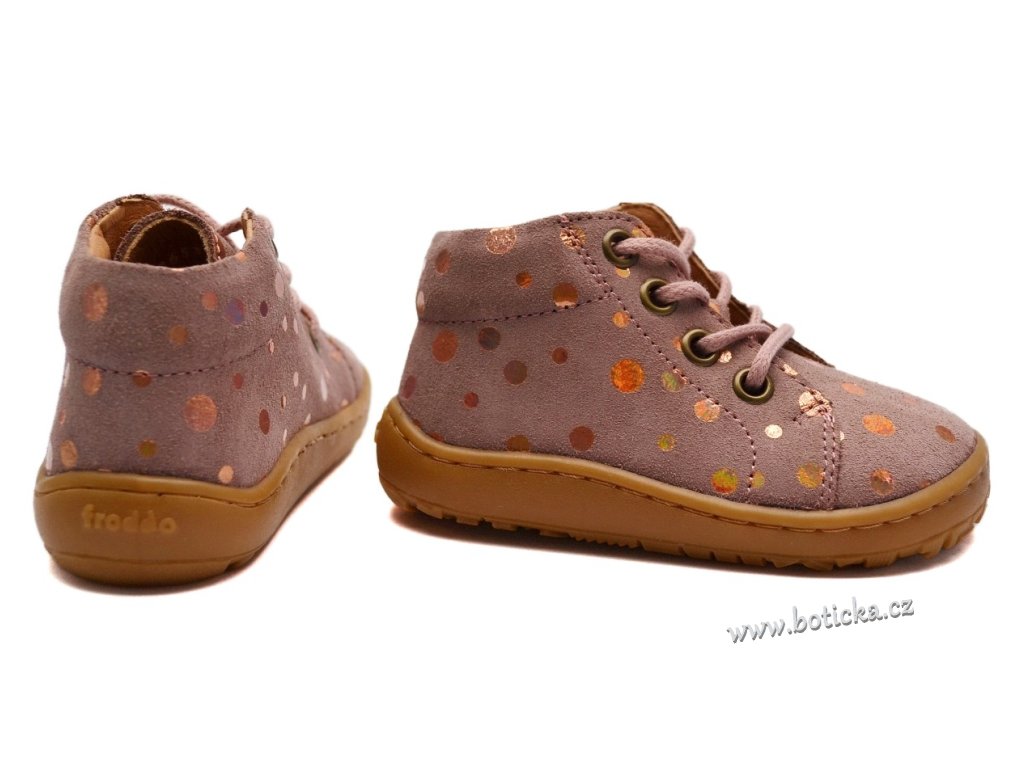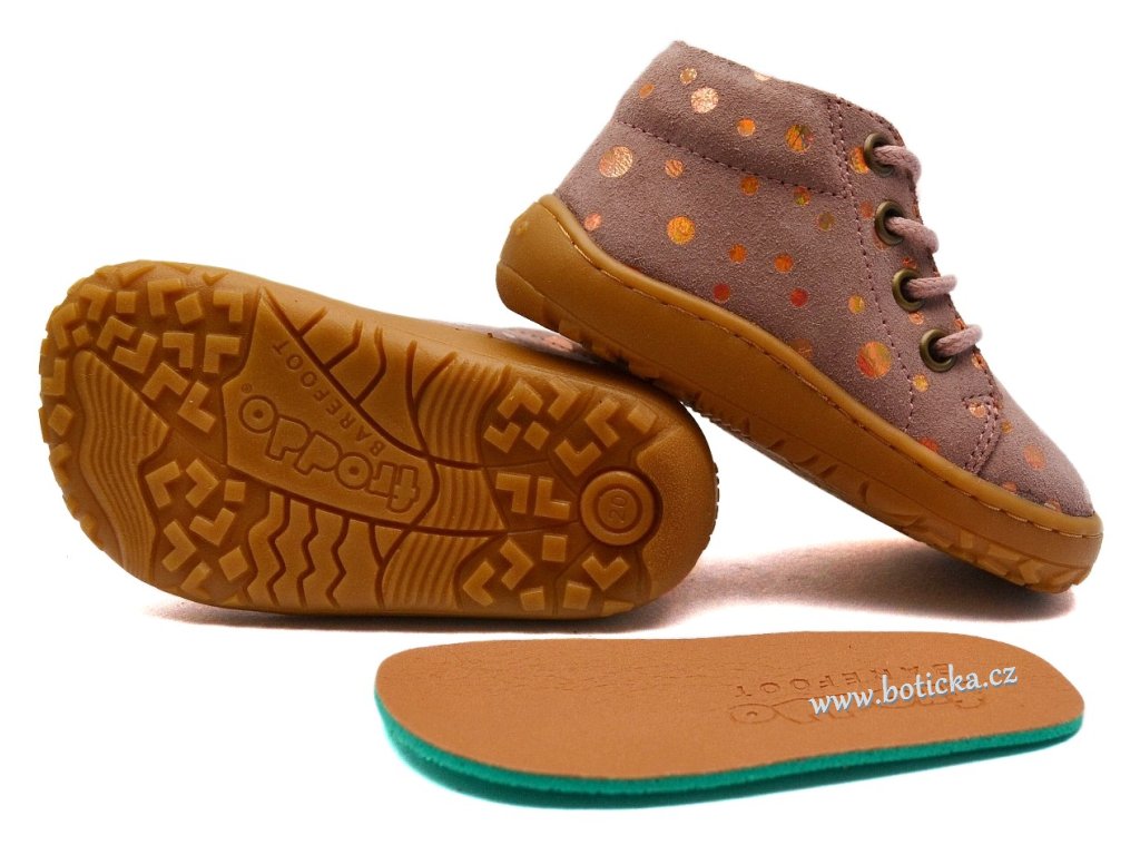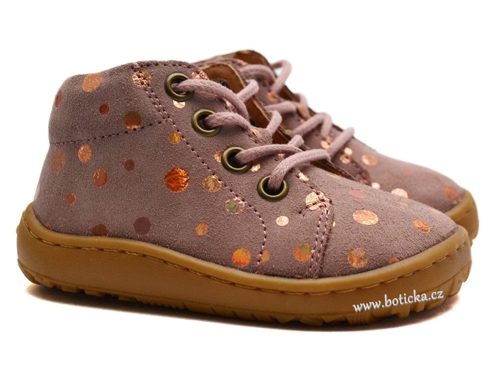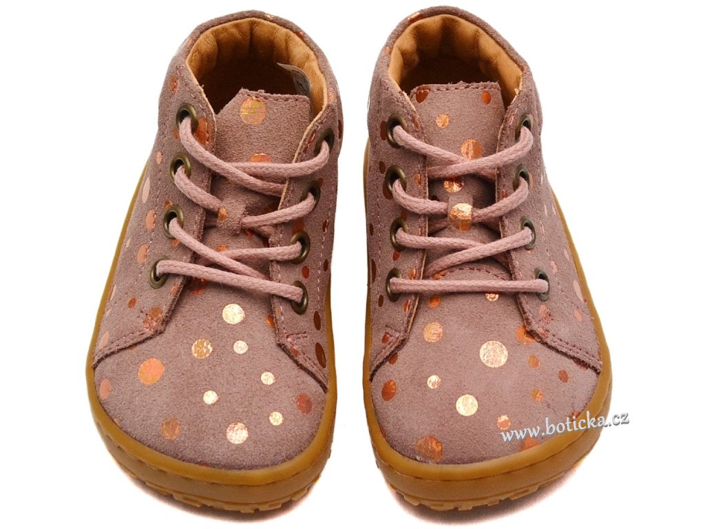 Jde o dětskou, koženou, barefootovou obuv, šněrovací, vhodná nejlépe do měkkého nerovného terénu, jako je zahrada, písek, kamínky a podobně. Výhodou je ohebná podešev, rozšíření v místě prstů a vyjímatelná kožená stélka.