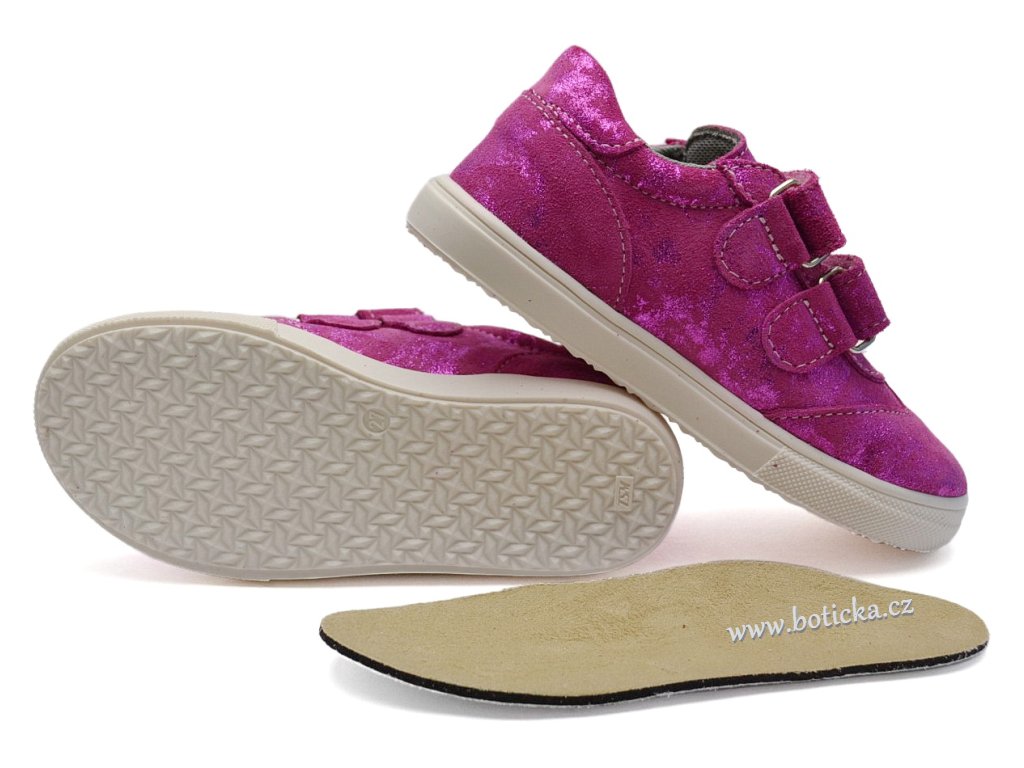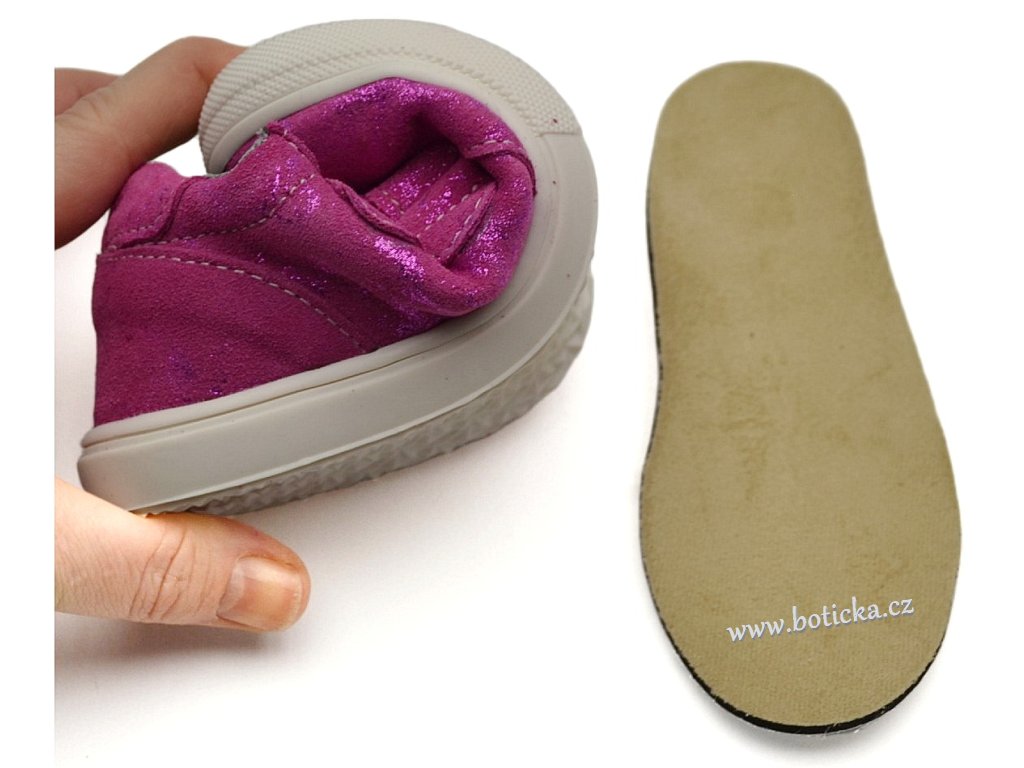 Celoroční vycházkové kožené botičky, velmi lehké, s ohebnou podešví, vyrobené z broušené kůže s textilní podšívkou. Zapínání na dva suché zipy. Výhodou je vyjímatelná kožená stélka a středně zpevněný opatek. Tyto botičky jsou vhodné do cca 5-18°C, v závislosti na individuální tělesné termoregulaci dítěte. Vyrobeno v ČR.