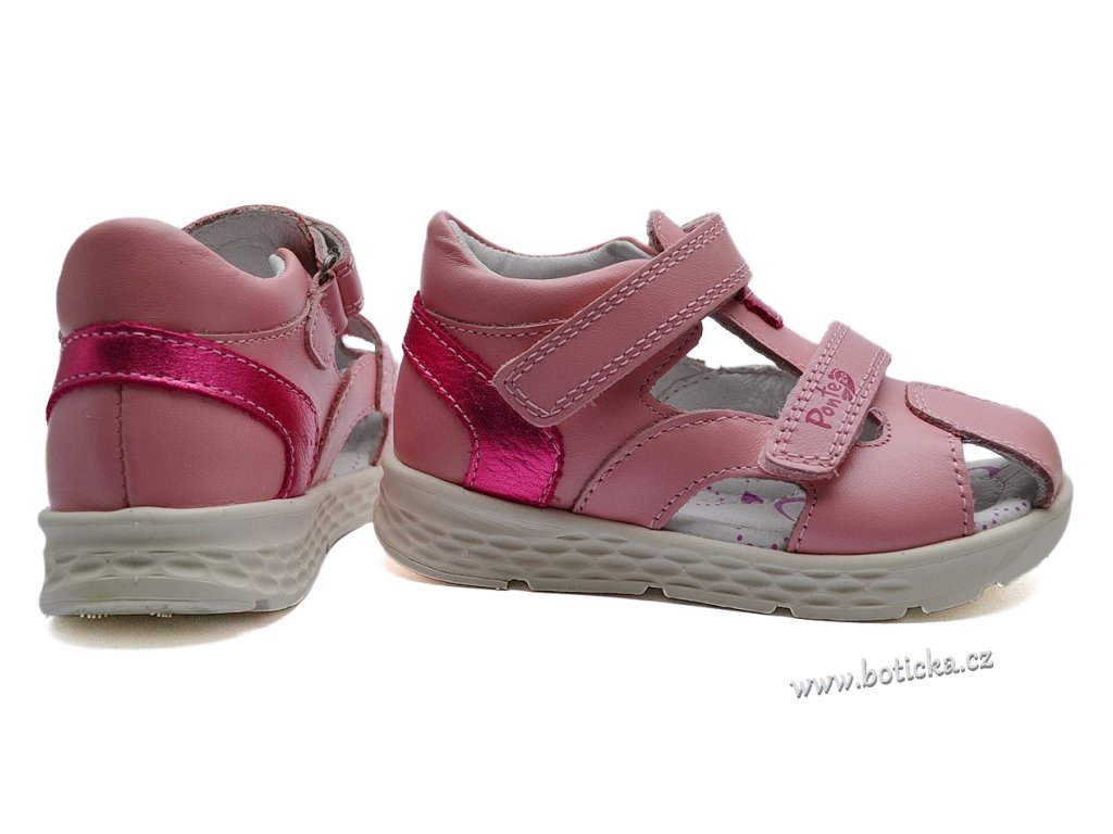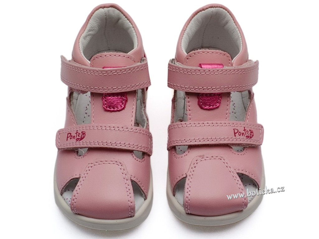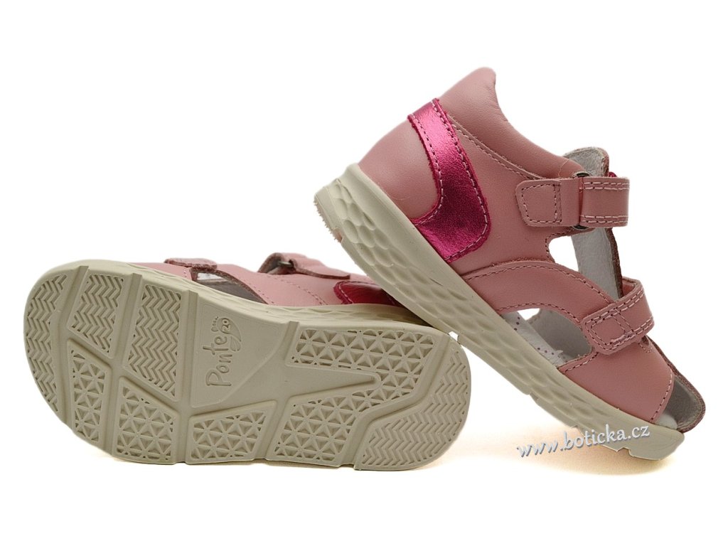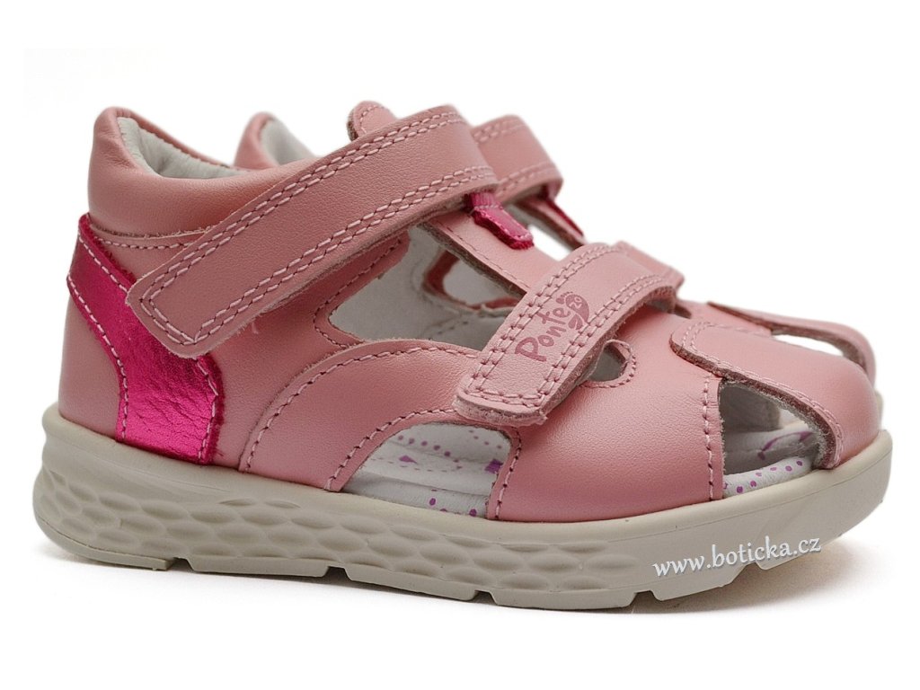 Dětské kožené vycházkové sandálky s koženou stélkou, nastavitelným nártem a zpevněným opatkem. Ohebné v přední částky botičky. Díky kryté špičce chrání dětské prstíčky před zraněním, střední střih.