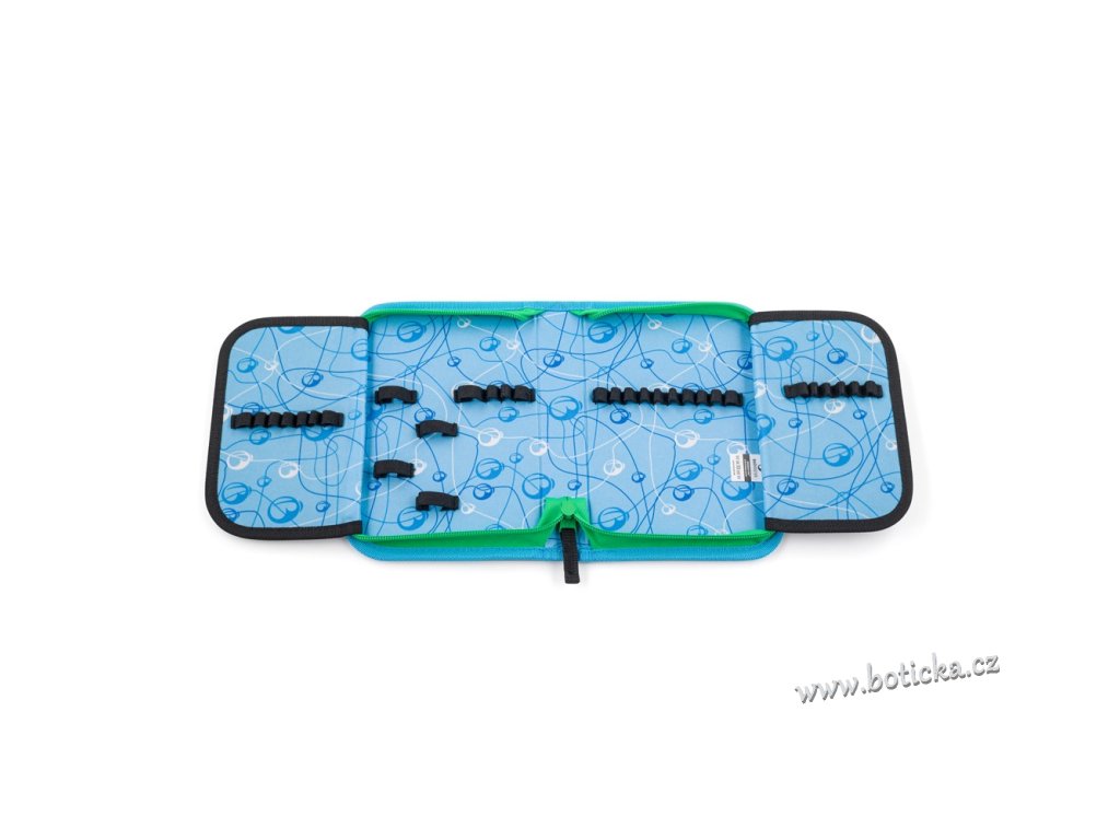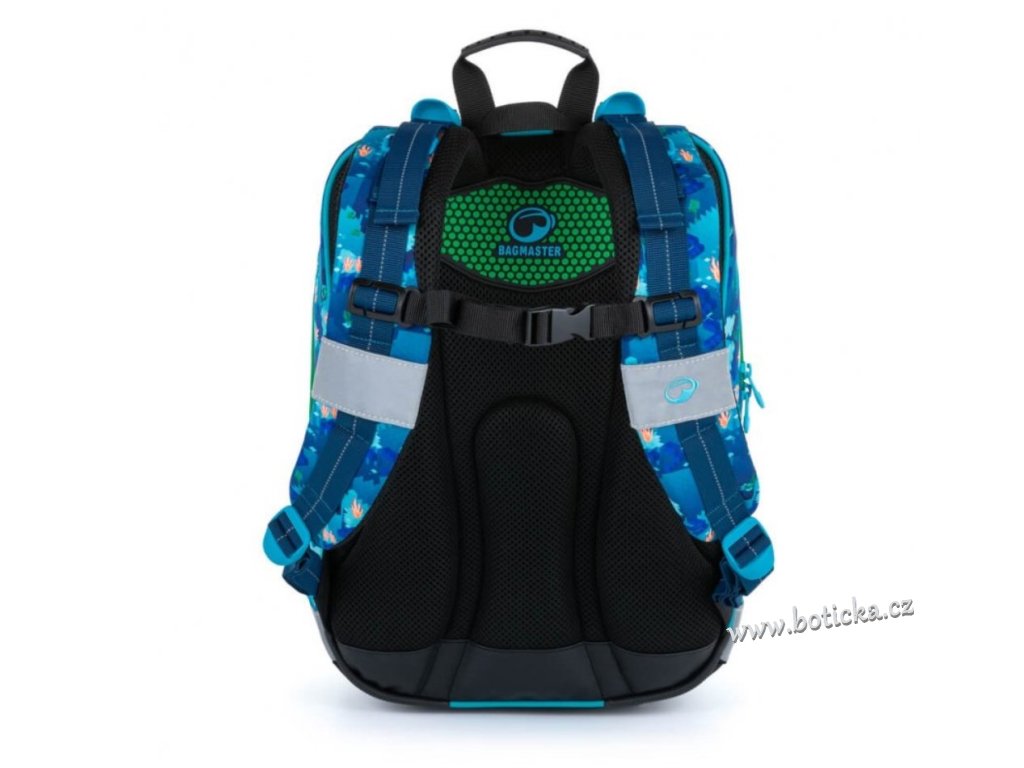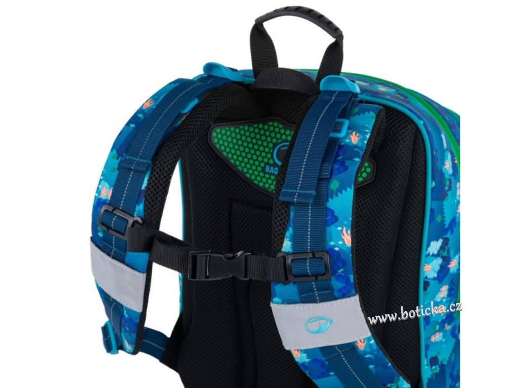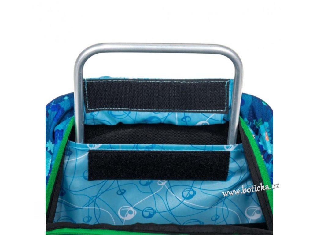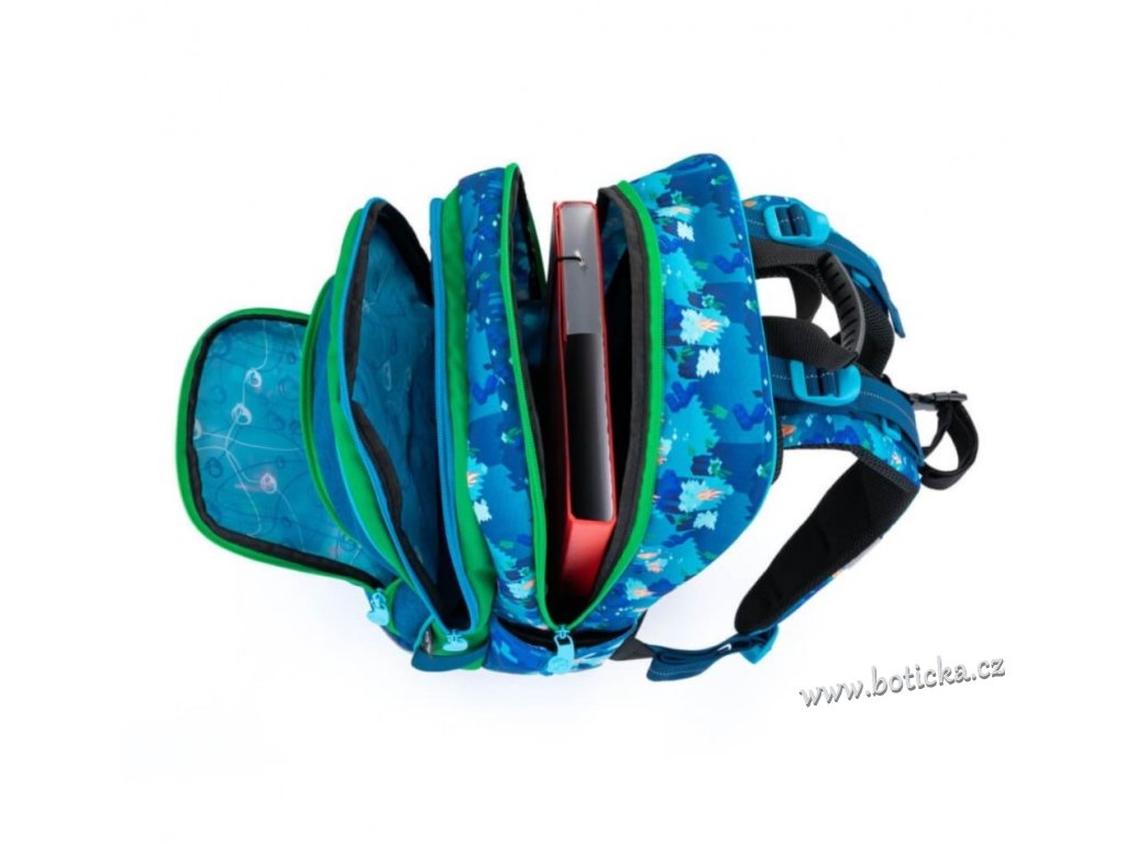 - V druhé komoře je organizér na tužky, mobil, peněženku a karabina na klíče. Na tu můžete školákovi připnout třeba samonavíjecí klíčenku (není součástí batohu, můžete dokoupit v kategorii doplňků).