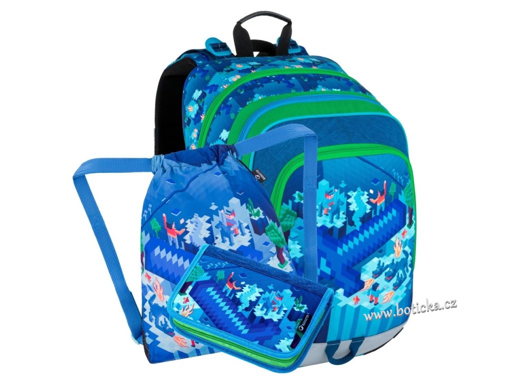 Set tříkomorového školního batohu se zdravotním posudkem, penálu a látkového vaku s oblíbeným kostičkovaným obrázkem.