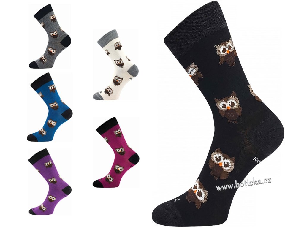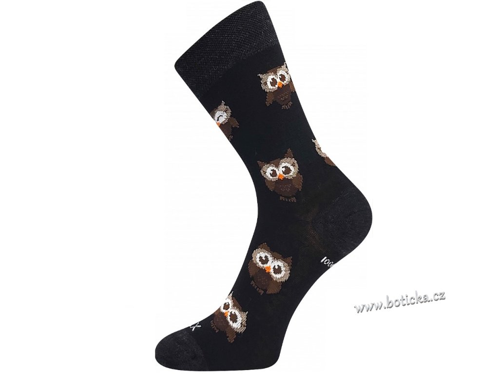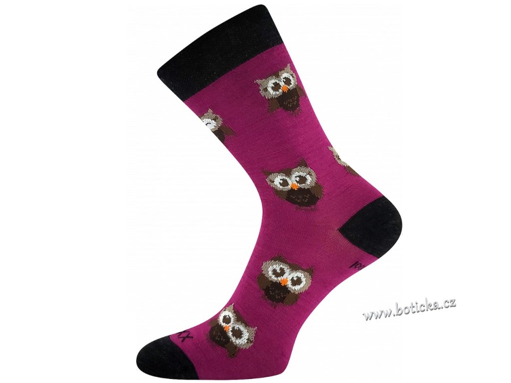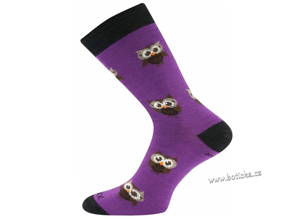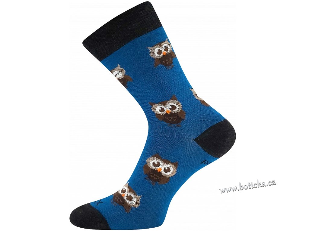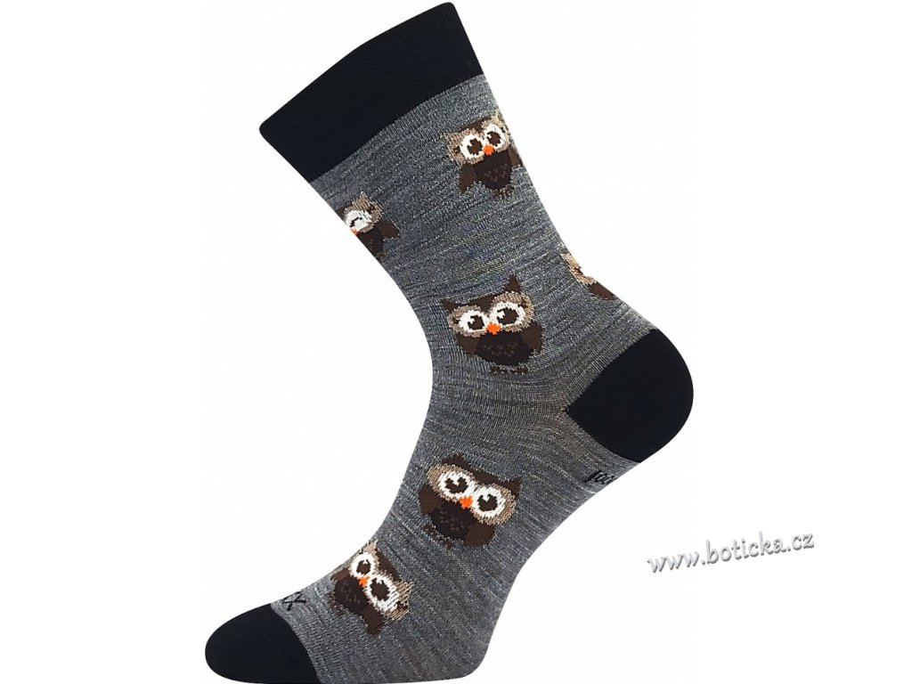 Vlněné merino ponožky VoXX® BUBO s obrázky roztomilých malých soviček. Slabé ponožky jsou i tak teplé a hřejivé díky přírodnímu materiálu vlně merino. Další výhodou je antibakteriální vlastnosti díky materiálu silproX® s ionty stříbra. Jsou odolné proti opotřebení, mají vyztuženou špičku a patu. Ponožky jsou v teplotní třídě B-C.