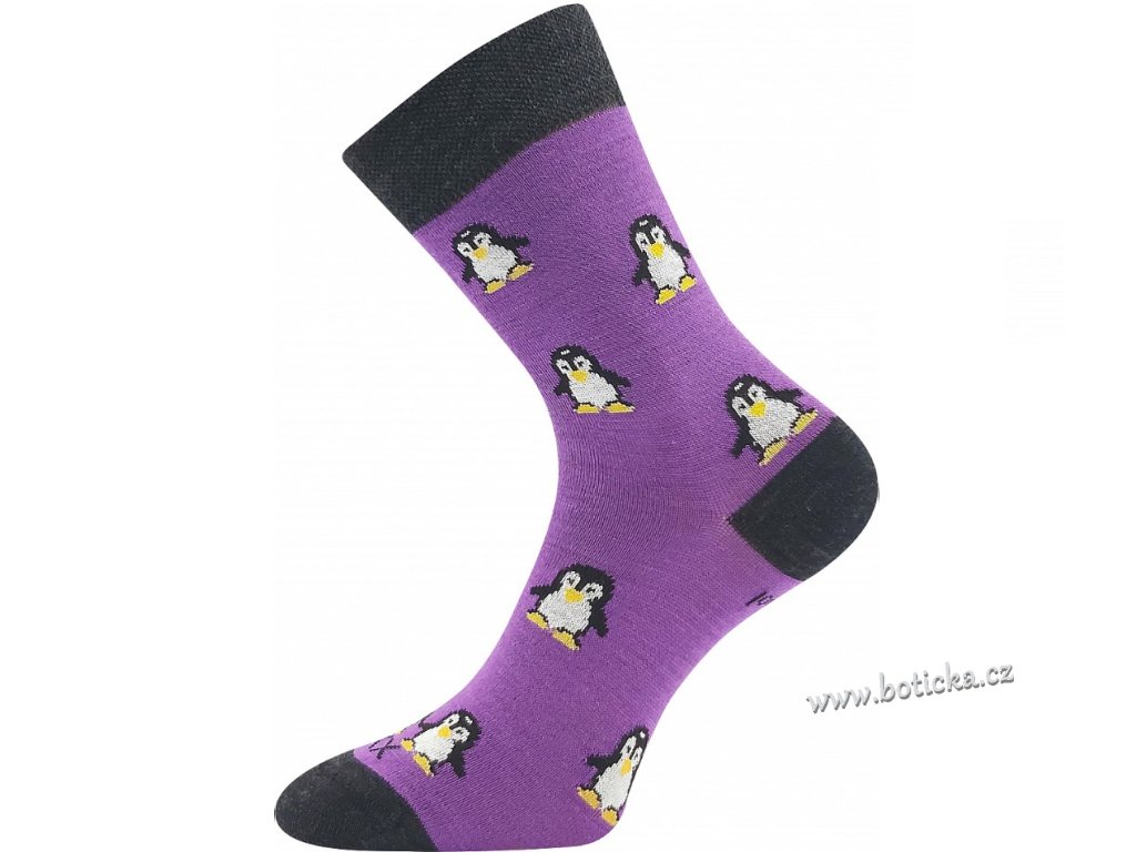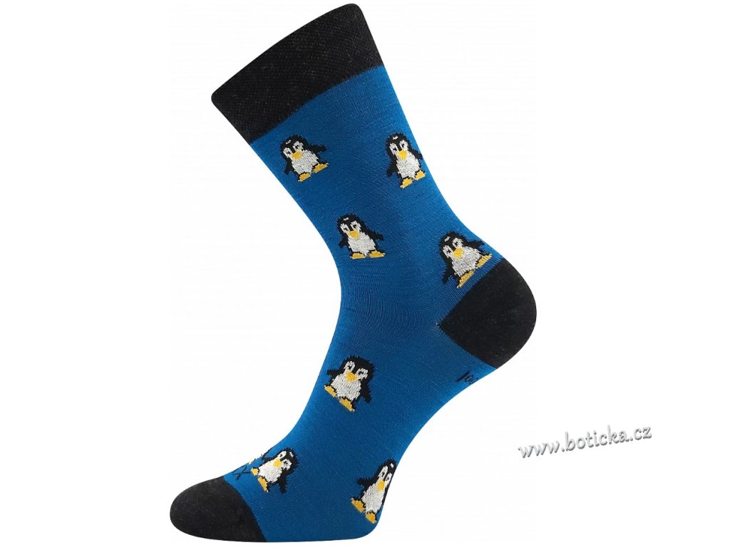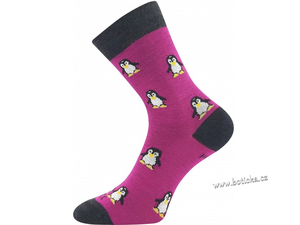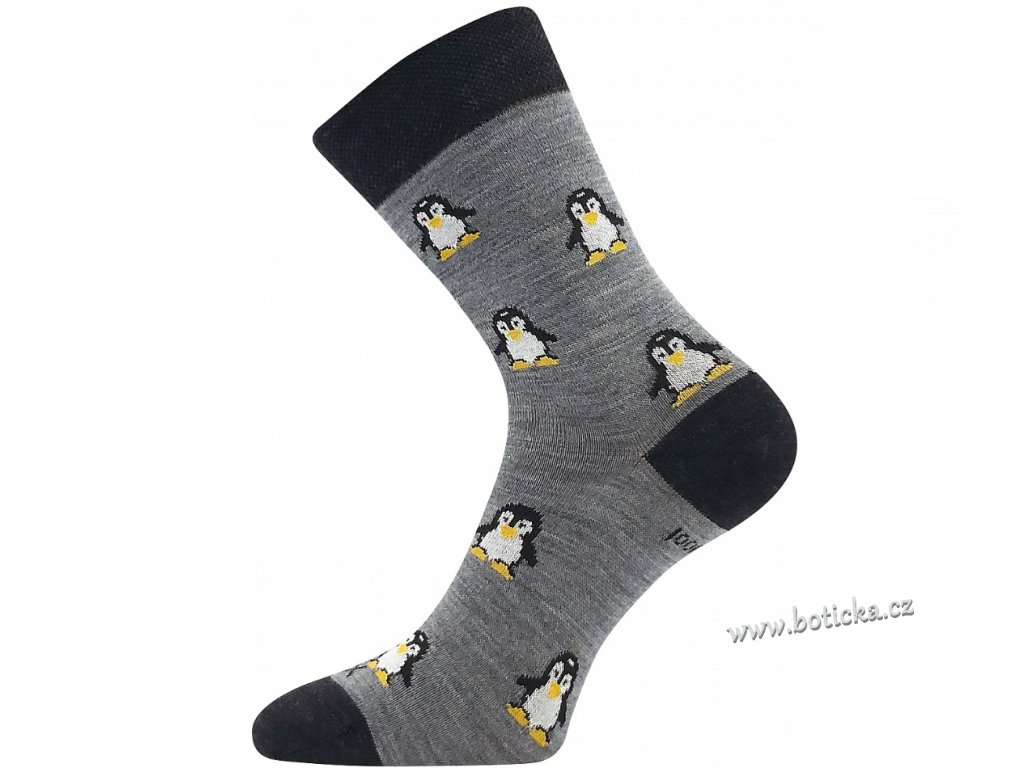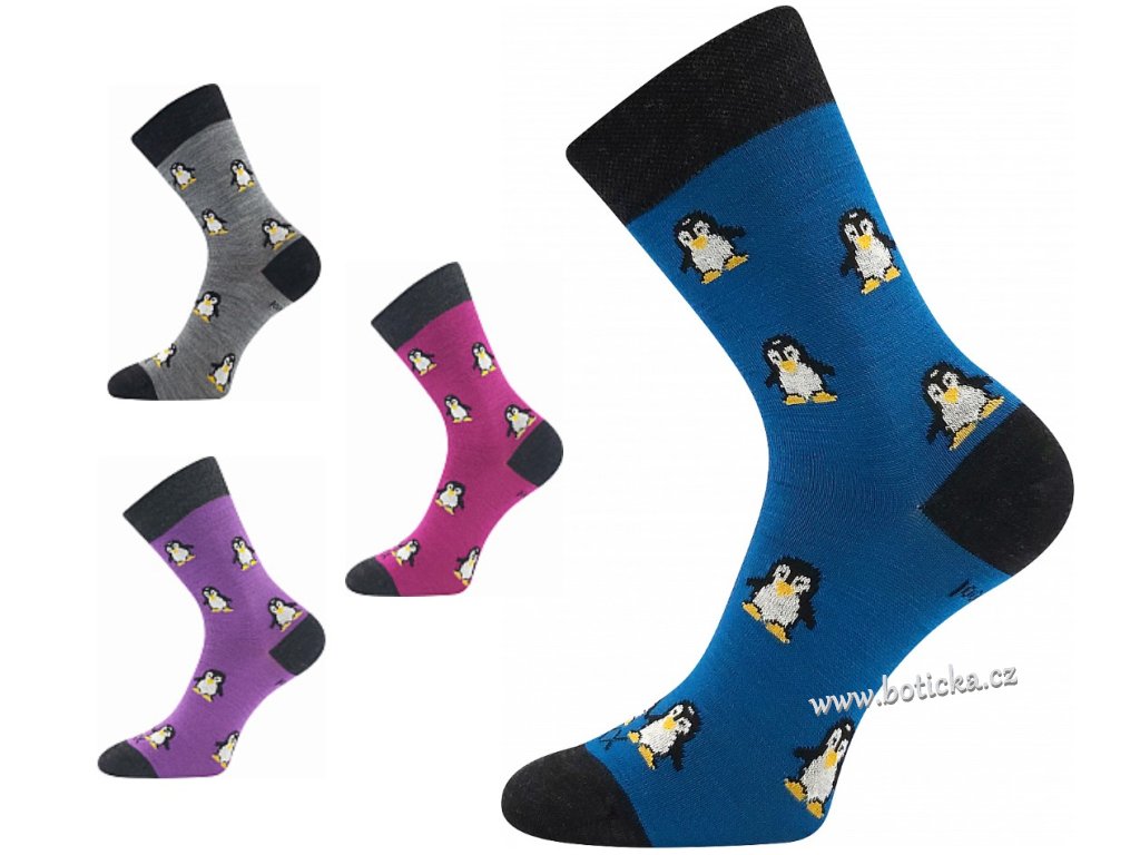 Vlněné merino ponožky VoXX® SNĚŽENKA s vtipnými obrázky tučňáků jsou roztomilé na první pohled. Zároveň jsou odolné proti opotřebení, mají vyztuženou špičku a patu. Teplé slabé ponožky mají špici uzavřenou řetízkováním, takže nikde netlačí. Materiály merino vlna a silproX® s ionty stříbra jsou přirozeně antibakteriální, omezují tvorbu bakterií a plísní – ty jsou v ponožkách přirozeně zničeny a nedochází pak k tvorbě zápachu. Ve vlněných ponožkách už studené nohy rozhodně mít nebudete, ponožky mají teplotní třídy B-C.
