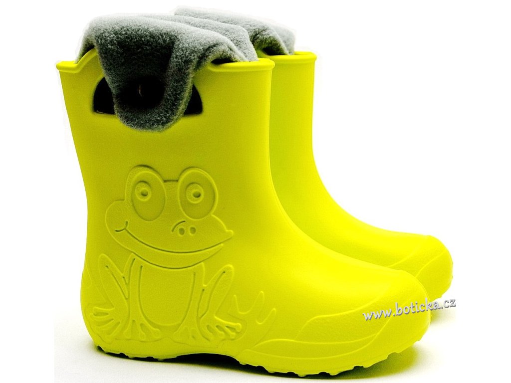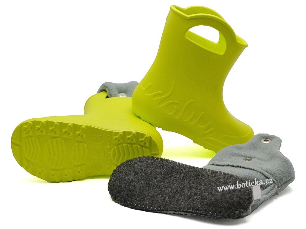 Gumáky / sněhule s vnitřní vyjímatelnou fleecovou vložkou (materiál vložky je certifikován pro použití i u nejmenších dětí). Boty jsou mrazuvzdorné, s vnitřní vložkou použitelné až do -10°C. Boty jsou vyrobeny z výjimečně lehkého flexibilního materiálu EVA, jejich váha je přibližně 200 gramů. V rámci gumáků / sněhulí jsou jedinečné zúženou zpevněnou patou, díky které v těchto botách budou hezky chodit i nejmenší děti. Vnitřní vložka je pratelná v pračce na teplotu maximálně 50°C. Na jaře lze vložku vyndat, nahradit klasickou stélkou a děti mají na zbytek jara a léto holinky.