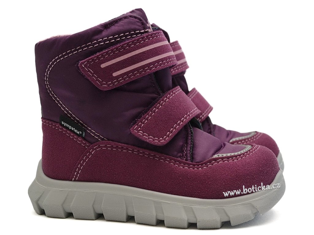 Zimní dívčí, vycházková, nepromokavá obuv, se zapínáním na suchý zip, s vyjímatelnou stélkou, s membránou SYMPATEX®. Tyto botky je vhodné nosit při teplotě 8°C a méně, ve vyšší venkovní teplotě může docházet k přehřívání nožiček a pocení. Horní hranice teploty pro nošení zimní obuvi je závislá i na vnitřní termoregulaci dítěte.