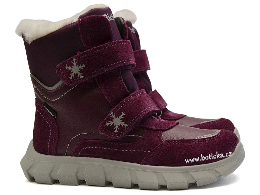 Zimní vycházková, naprosto nepromokavá, obuv se zapínáním na suchý zip, s vyjímatelnou stélkou, s membránou SYMPA TEX®, velmi lehká, ohebná podešev, vhodné pro štíhlé a střední nožičky bez vysokého nártu.